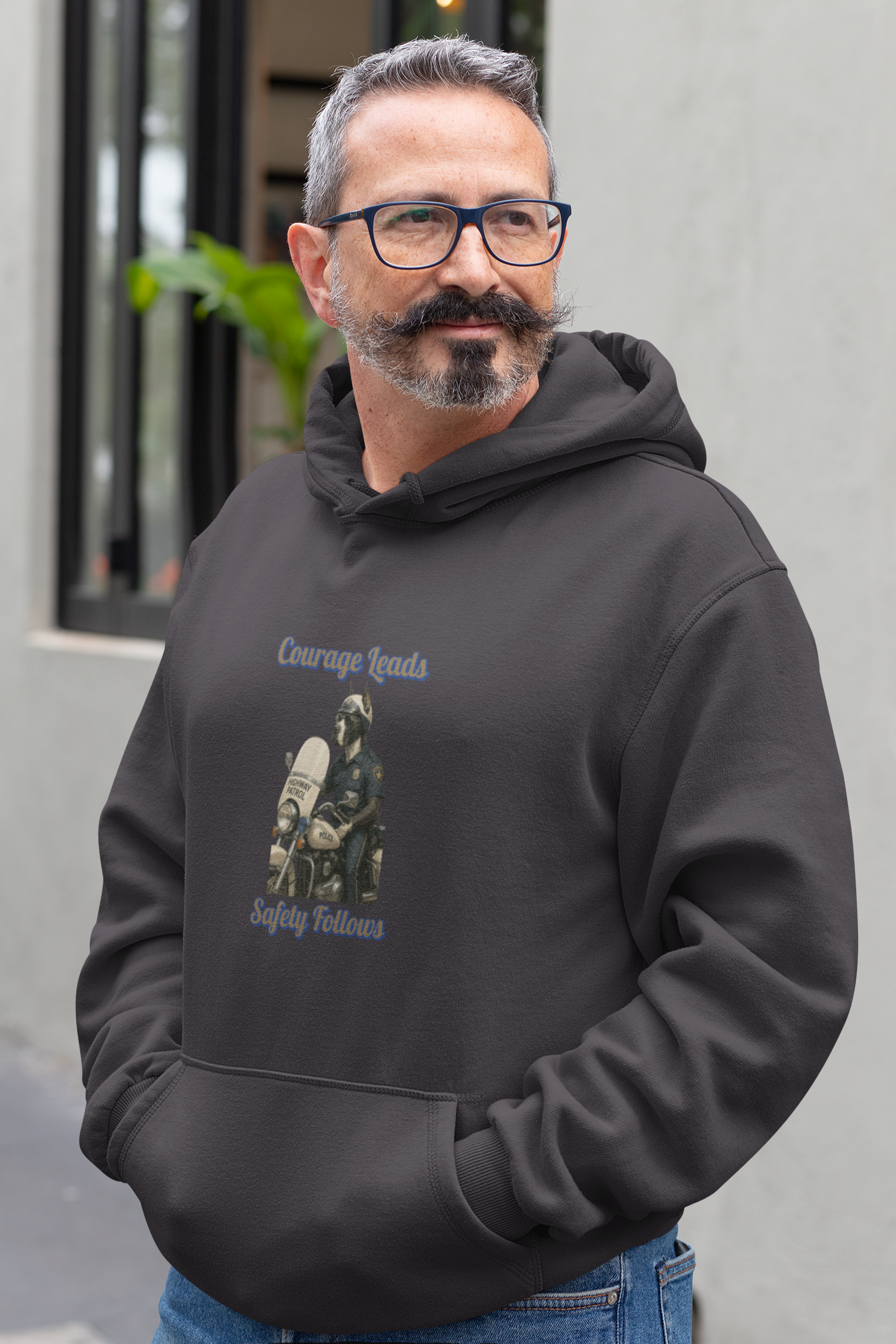 This striking illustration depicts an anthropomorphic dog as a highway patrol police officer, embodying the message "Courage Leads, Safety Follows." The image features a muscular canine figure dressed in a classic police uniform, complete with a badge, dark sunglasses, and a police cap. He stands alongside a vintage police motorcycle, with "Highway Patrol" prominently displayed on the windshield. The artwork is rendered in a detailed, realistic style against a black background, creating a dramatic and powerful visual impact. The color palette consists of muted blues, grays, and cream tones, giving the image a sophisticated and professional feel. The motorcycle appears to be a classic model, meticulously detailed with chrome elements and authentic police markings. The dog's posture suggests authority, discipline, and readiness, symbolizing the dedication of law enforcement officers. The text at the top and bottom of the image, "Courage Leads, Safety Follows," reinforces the theme of protection and public service. This unique artistic representation transforms a traditional law enforcement scene into a compelling narrative about courage, responsibility, and keeping communities safe. The image serves as a creative tribute to highway patrol officers and their critical role in maintaining road safety.Fantasy Dog Portraits