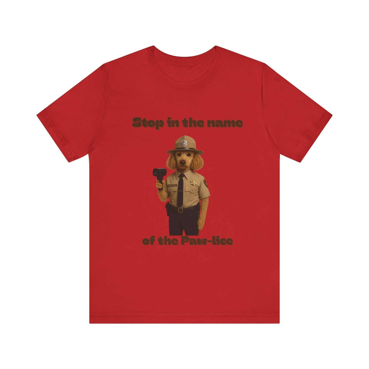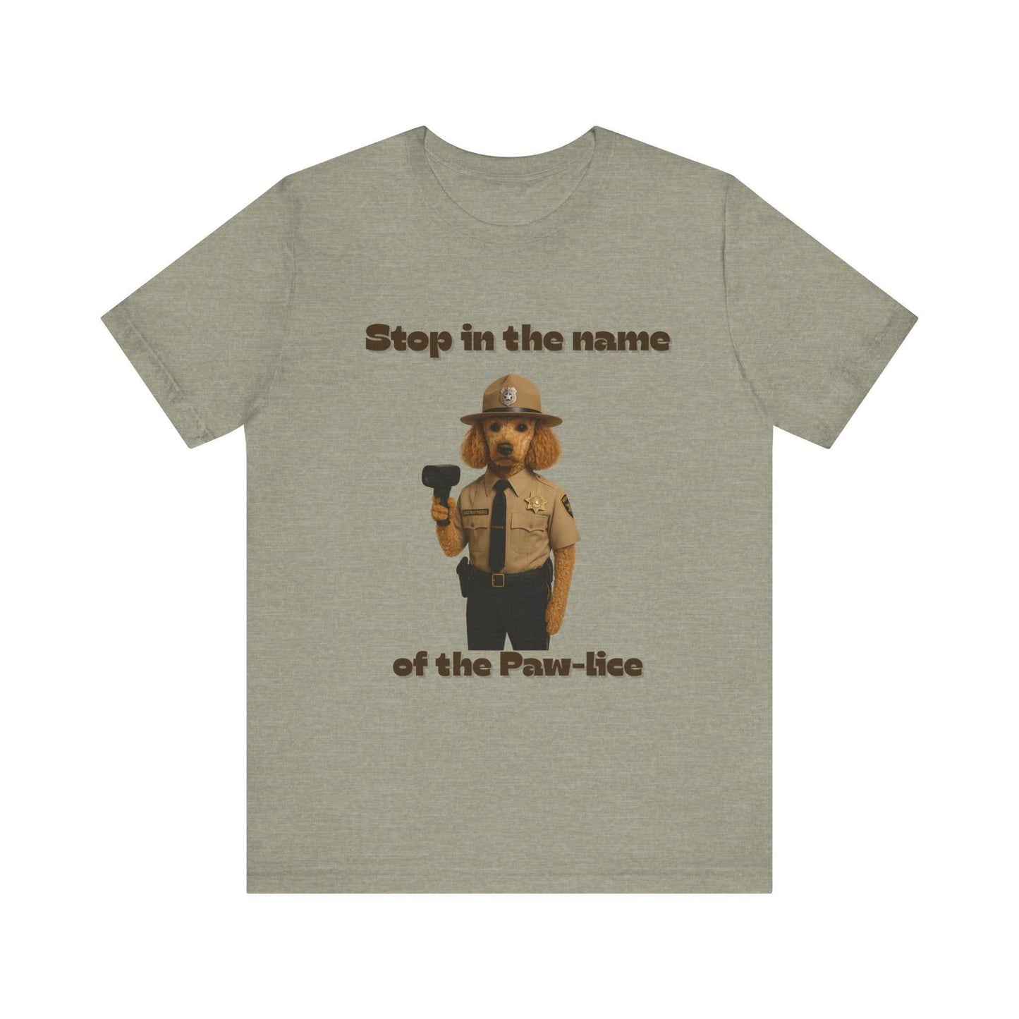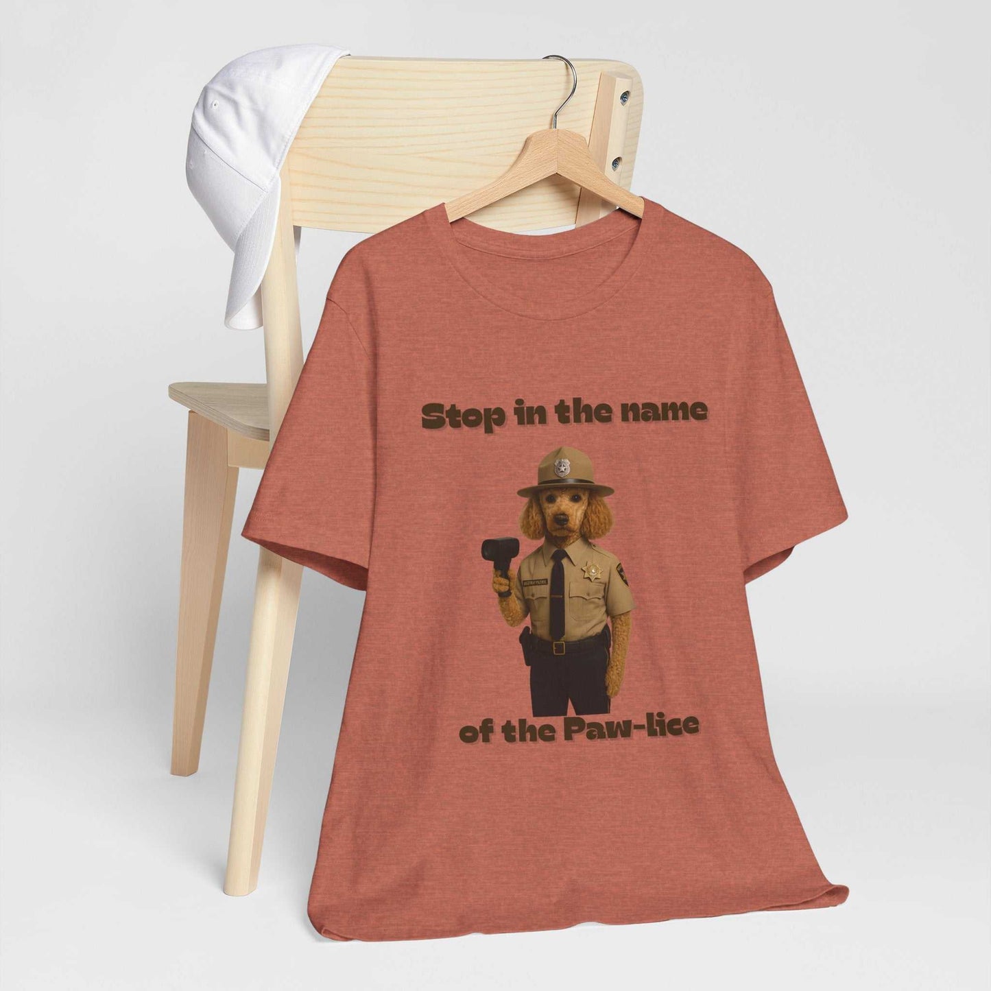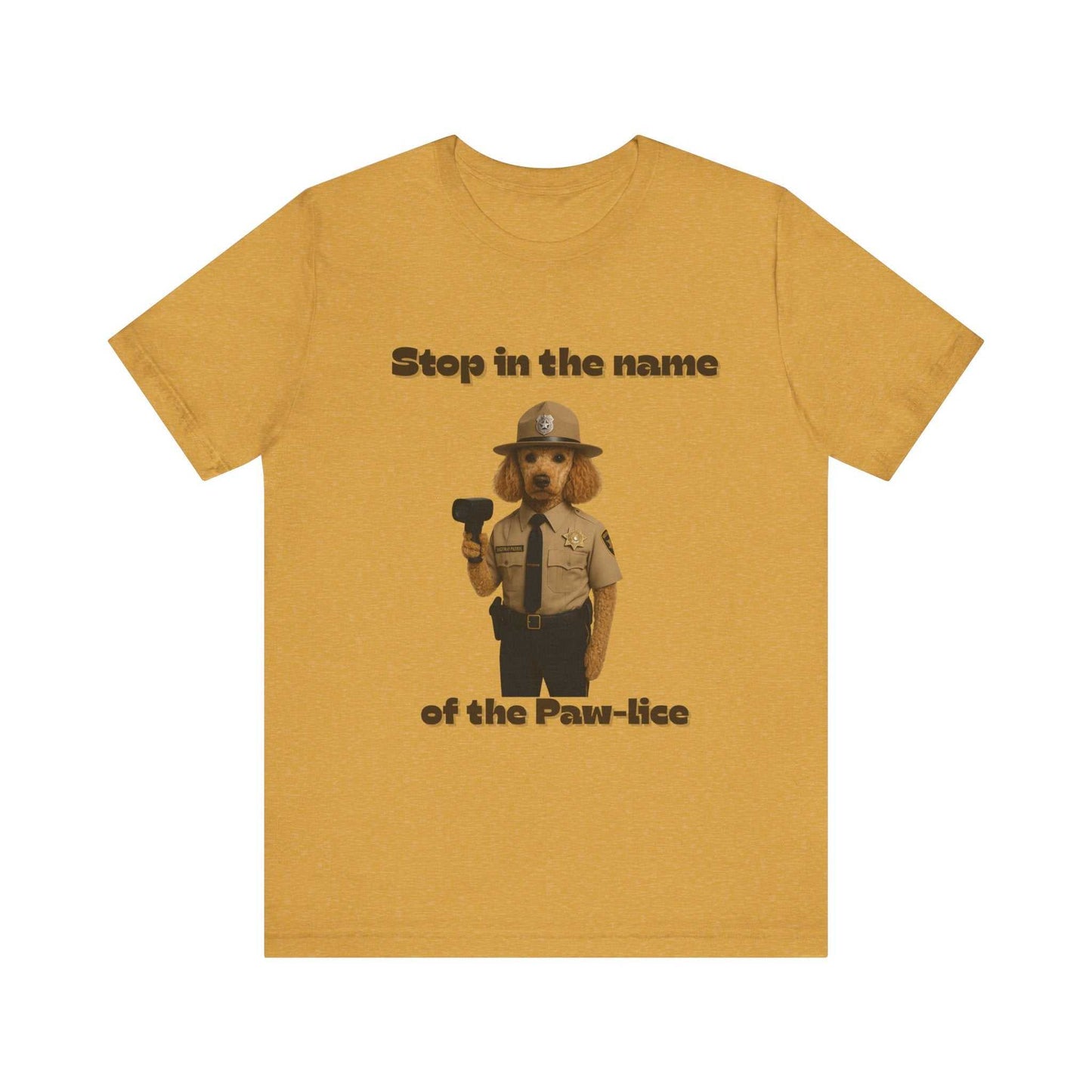 Introducing the "Paw-lice" officer, a charming and humorous photographic portrayal of a golden-furred canine dressed in full law enforcement attire. The image features a poodle-like dog wearing an authentic highway patrol uniform, complete with a beige shirt, black tie, badge, and a classic wide-brimmed campaign hat. Positioned against a stark black background, the dog strikes an official pose while holding what appears to be a flashlight, embodying the serious demeanor of a dedicated police officer. The playful wordplay "Stop in the Name of the Paw-lice" adds a whimsical touch to the professionally staged photograph, highlighting the creative concept of anthropomorphizing a dog as a law enforcement professional. The attention to detail is remarkable, from the precisely positioned badge to the crisp uniform and official stance, creating a surprisingly convincing representation of a patrol officer. The golden-colored fur and floppy ears of the dog provide a delightful contrast to the serious uniform, making the image both amusing and endearing. This cleverly conceived photograph transforms a typical dog into a symbol of authority, blending humor with a remarkably realistic portrayal of a highway patrol officer. The high-contrast black background ensures that all focus remains on the canine cop, making the visual joke even more impactful. Professional lighting and skilled photography bring this imaginative concept to life with stunning clarity and precision. The image is a perfect blend of comedy, creativity, and photographic expertise that is sure to bring a smile to viewers' faces.Fantasy Dog Portraits