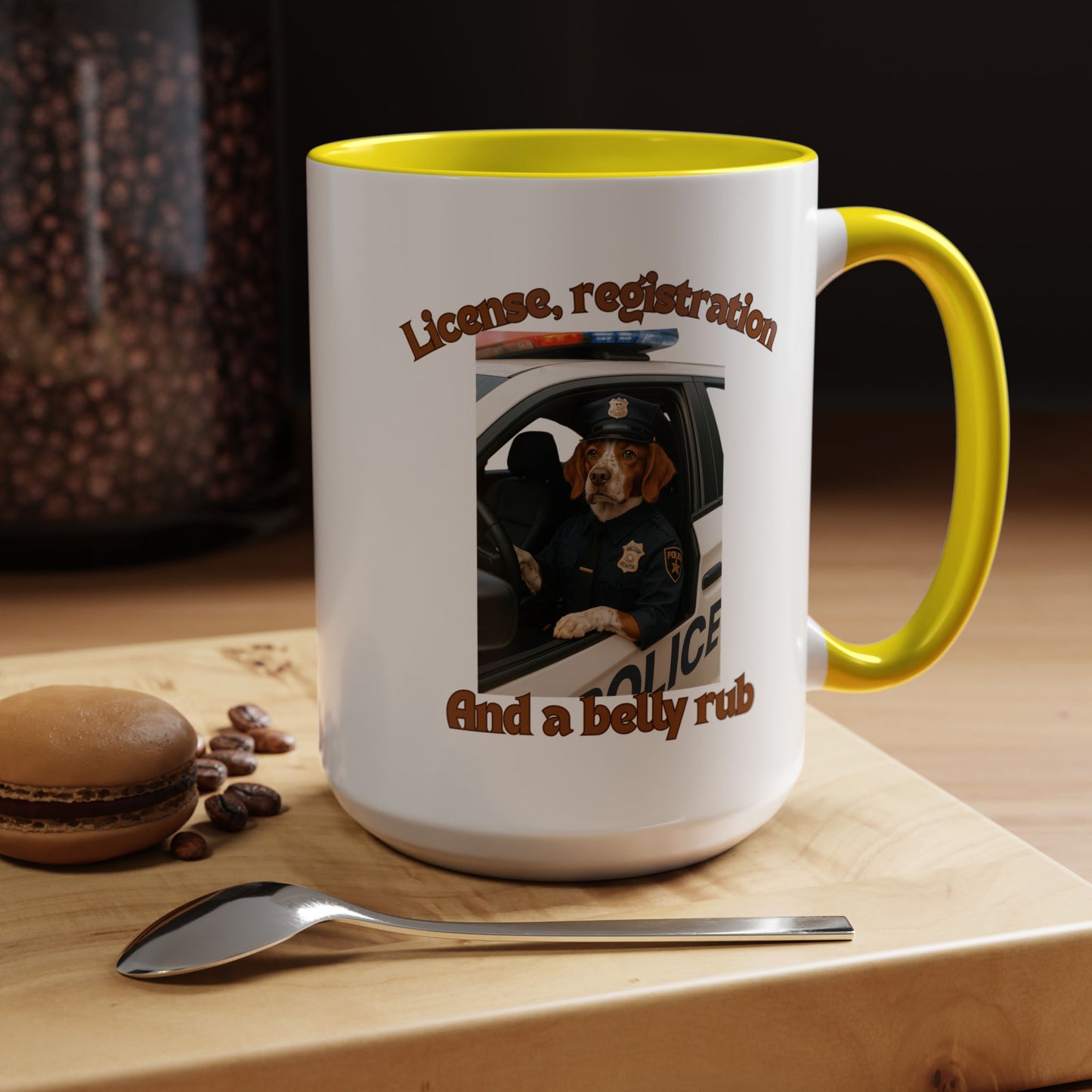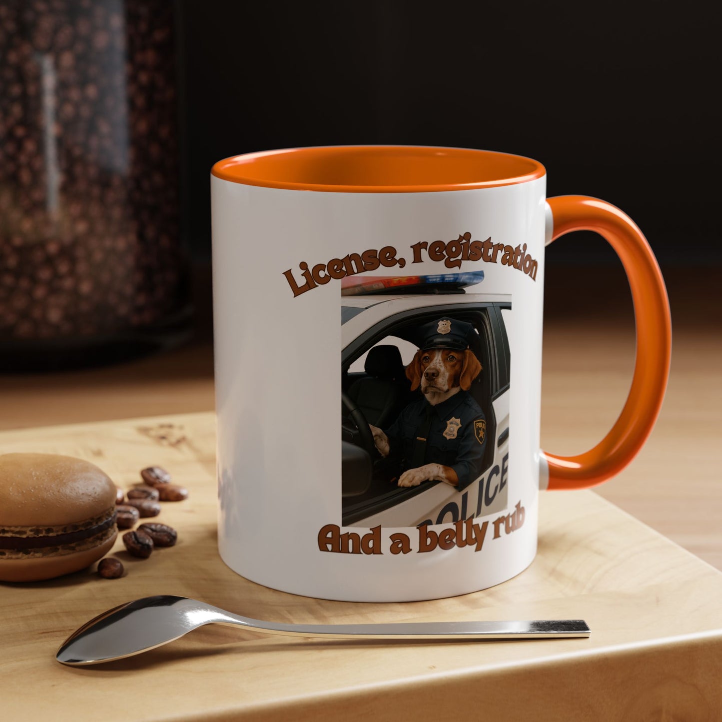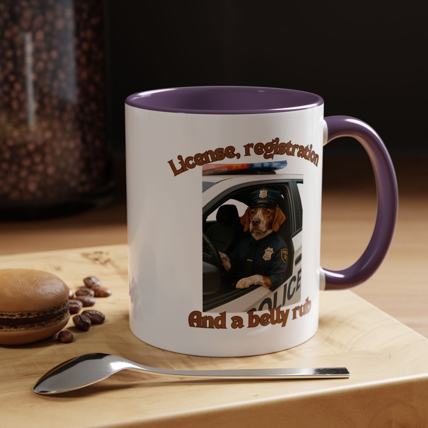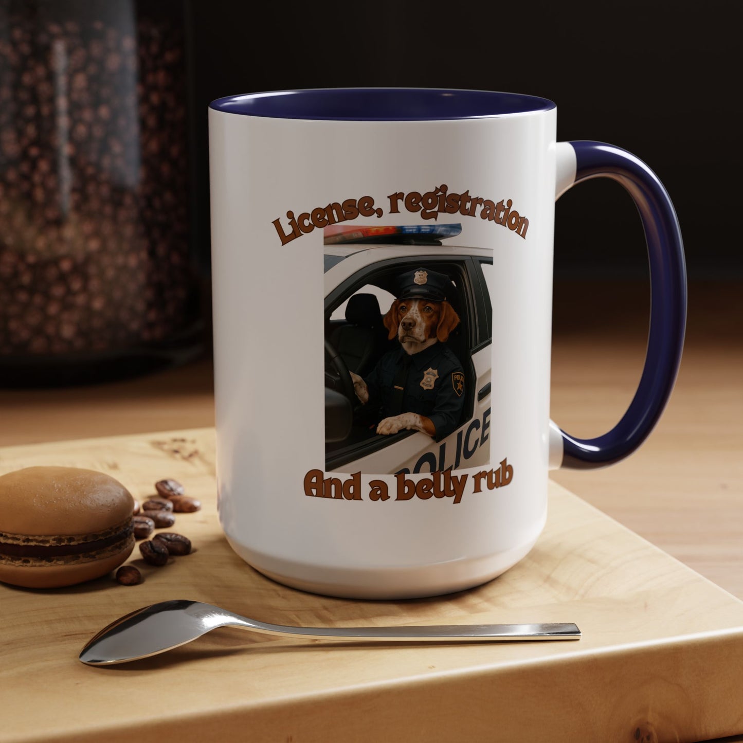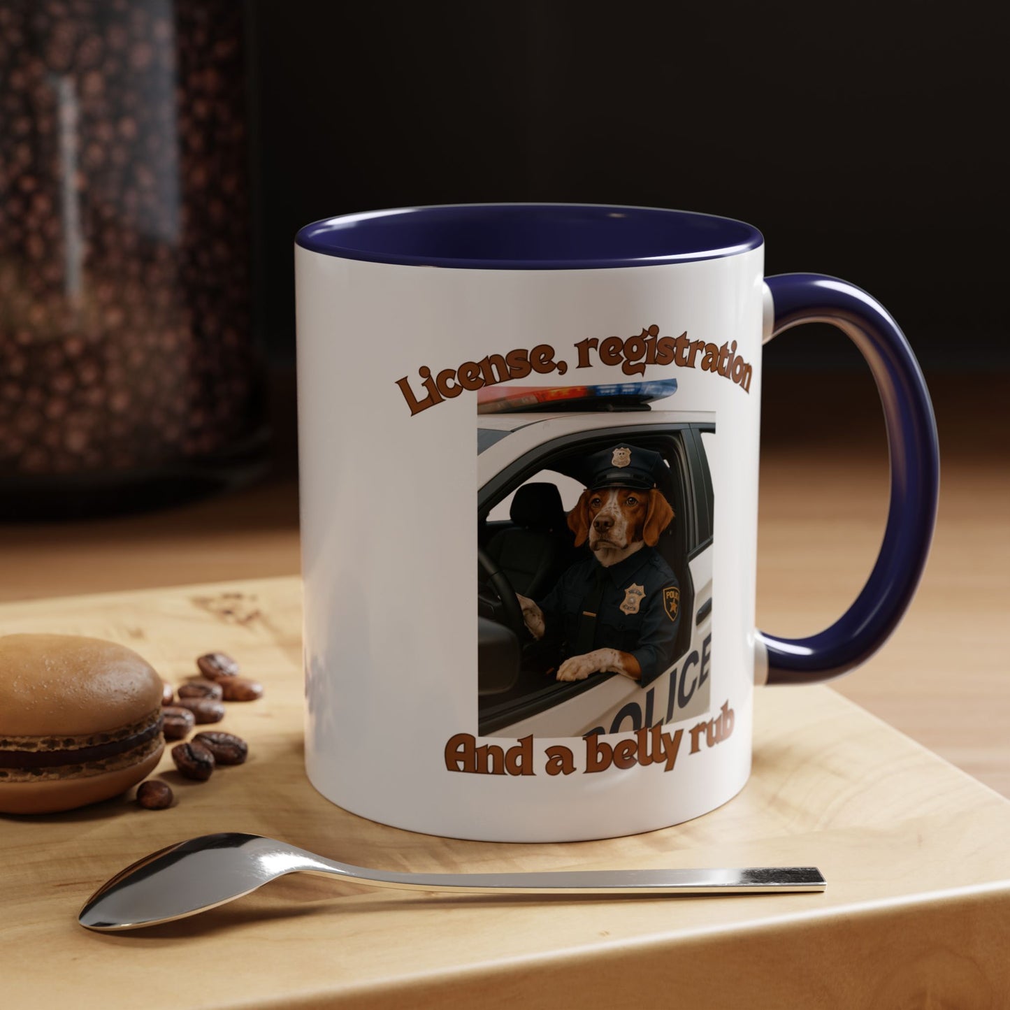 Get ready for the most adorable law enforcement officer you've ever seen! This humorous image features a charming Beagle dressed up in a full police uniform, complete with a cap and badge, sitting inside a police cruiser. The dog has a serious yet endearing expression, perfectly capturing the playful concept of a canine cop on duty. The police vehicle's distinctive black and white color scheme and flashing light bar add to the authentic feel of the scene. Clever text overlay reads "License, registration and a belly rub" - a hilarious twist on the standard traffic stop dialogue. The dog's expressive eyes and professional posture make this image both comical and heartwarming. Positioned in the driver's seat, the four-legged officer looks ready to enforce the law with a mix of authority and cuteness. The high-quality photography brings out the details of the dog's uniform and the police car's interior, creating a professional and entertaining visual. This image is sure to bring a smile to anyone who sees it, blending humor with the universal love of dogs. It's a creative and lighthearted take on law enforcement that showcases the playful bond between humans and their furry companions.