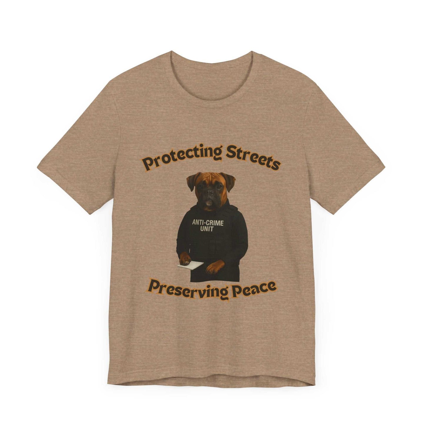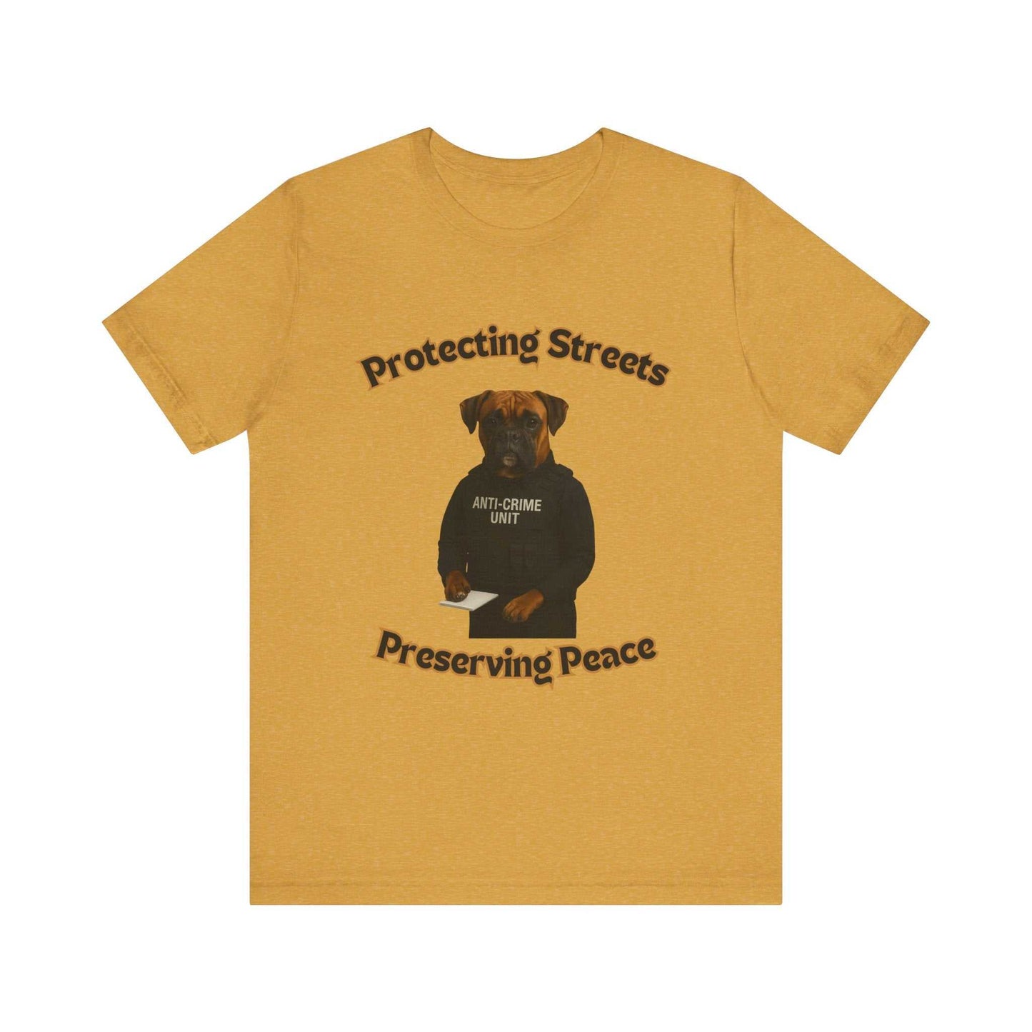 This powerful and humorous image features a Boxer dog dressed as a law enforcement officer in an "Anti-Crime Unit" vest, standing against a black background. The canine officer appears serious and professional, with a notepad in front of him and his paws positioned as if ready to take notes during an investigation. Curved text around the image reads "Protecting Streets" at the top and "Preserving Peace" at the bottom, emphasizing the dog's mock official role. The dog's expressive face, with a distinctive boxer breed appearance and wrinkled forehead, adds a touch of comedic seriousness to the concept. The image is a creative play on police and security imagery, anthropomorphizing the dog as a dedicated crime-fighting professional. The black tactical-style vest and the dog's pose suggest discipline and commitment to public safety. The photographic composition is clean and dramatic, with high contrast and sharp details that highlight the dog's features and costume. This clever visual pun combines the protective nature of both dogs and law enforcement, creating a memorable and amusing portrayal of canine heroism. The image seems designed to both entertain and subtly celebrate the loyal and protective qualities of dogs. The professional staging and high-quality photography elevate this from a simple joke to an artful and engaging piece of visual comedy.Fantasy Dog Portraits