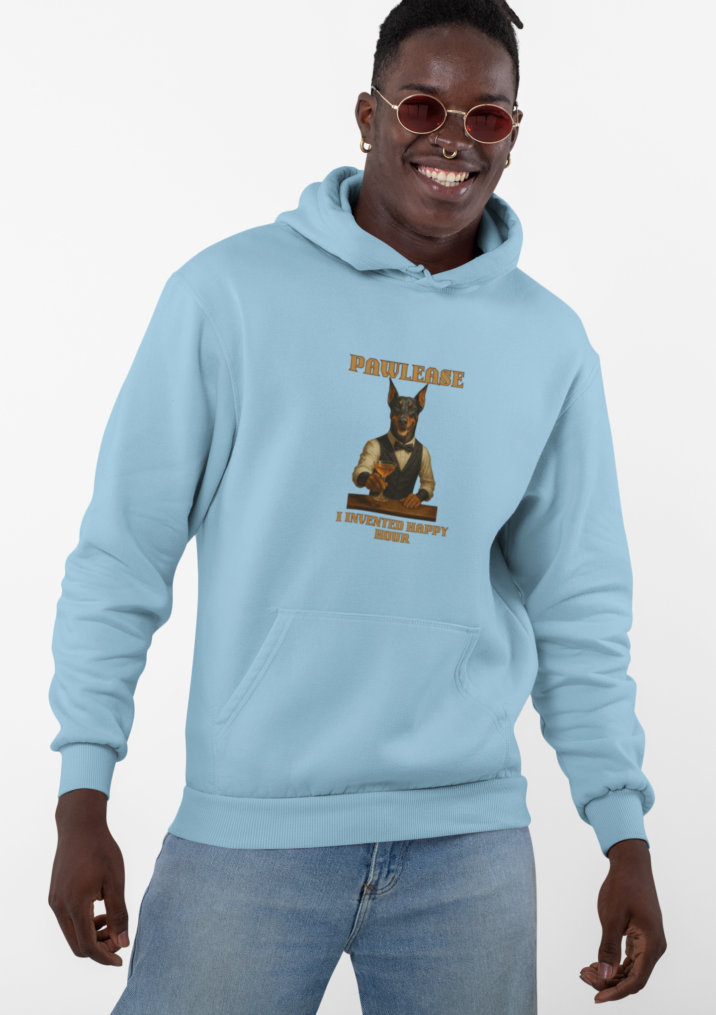 This humorous vintage-style poster features a Doberman Pinscher dressed as a sophisticated bartender, wearing a bow tie and vest while holding a cocktail glass. The image, titled "PAWLEASE I INVENTED HAPPY HOUR," depicts the dog with an anthropomorphic pose, standing behind a bar with a cheerful, open-mouthed expression. The graphic has a stylized, illustrative quality reminiscent of retro advertising art, with bold typography and a playful concept that personifies the dog as a charming mixologist. The dog is rendered with detailed shading and texture, giving it a lifelike appearance despite the whimsical scenario. The poster combines humor, animal imagery, and cocktail culture in a clever, eye-catching design that plays on the idea of a dog "inventing" happy hour.Fantasy Dog Portraits