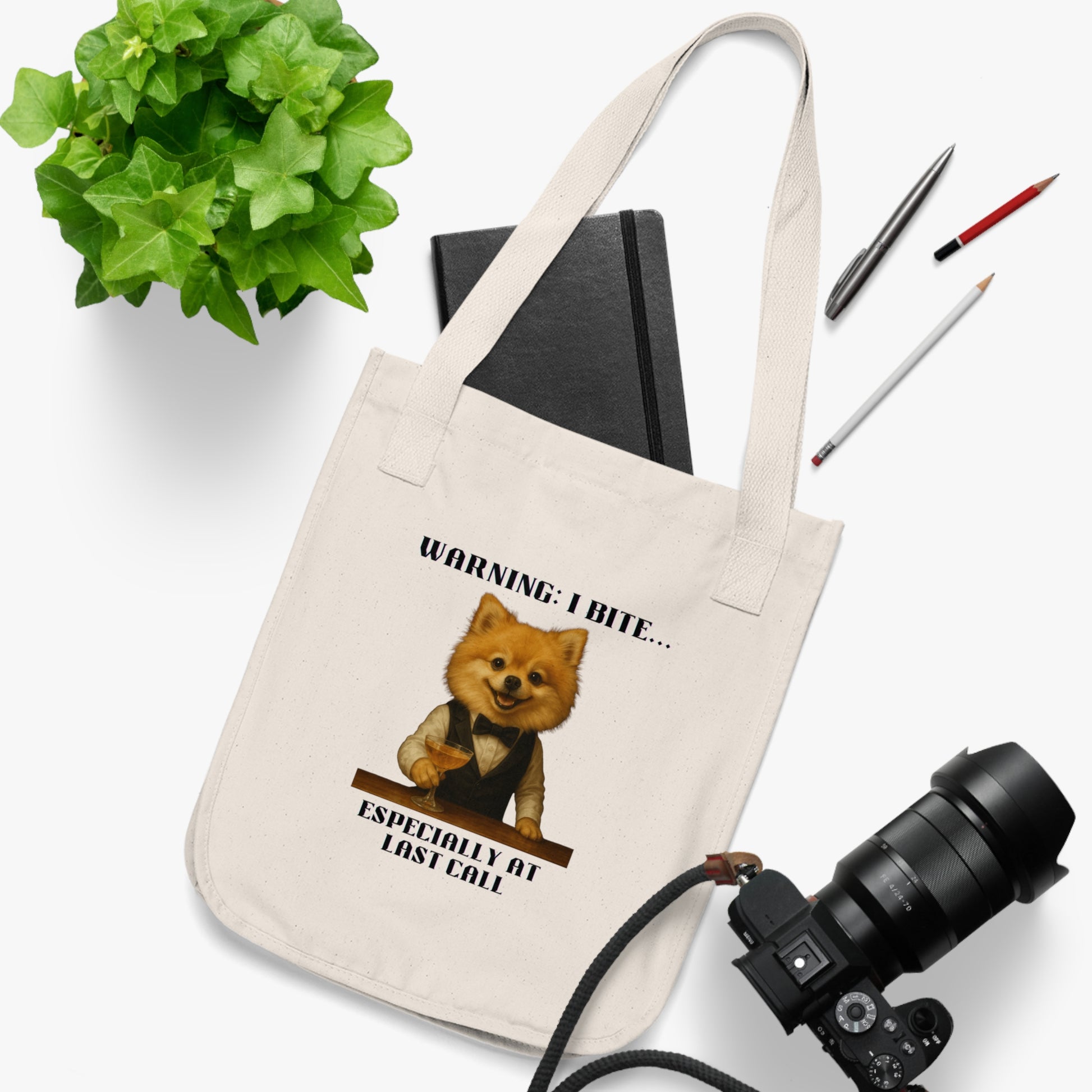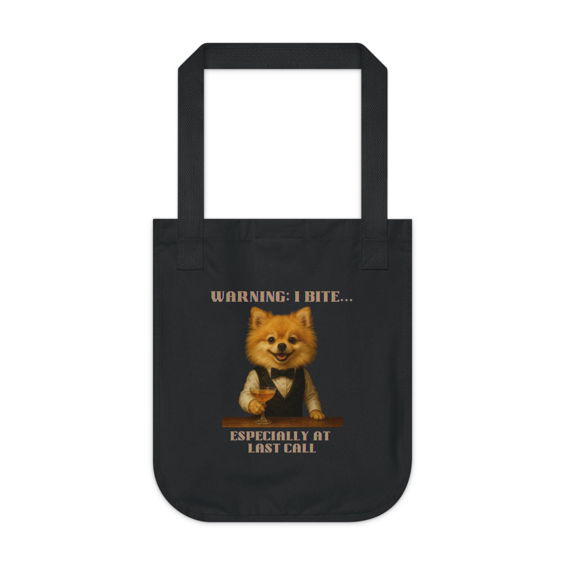 Discover a hilarious and whimsical vintage-style poster featuring an adorable Pomeranian dog dressed in a sophisticated tuxedo, standing behind a bar with a cocktail glass. The humorous image warns "WARNING: I BITE..." with a playful twist, continuing "ESPECIALLY AT LAST CALL" in bold, distressed typography. The small, fluffy dog has a cheeky grin and appears ready to serve or cause mischief at a bar setting. The poster combines anthropomorphic humor with a classic bar scene aesthetic, presenting the Pomeranian as a witty, slightly dangerous bartender. The image is designed in a retro poster style with glitch-like text effects, creating a comedic and eye-catching visual statement.Fantasy Dog Portraits
