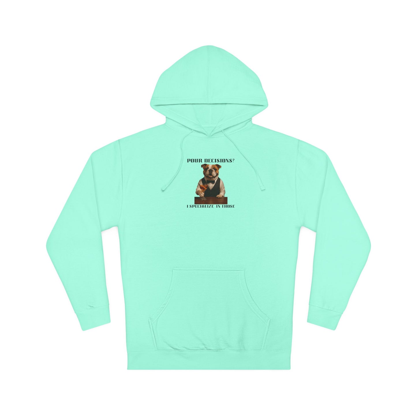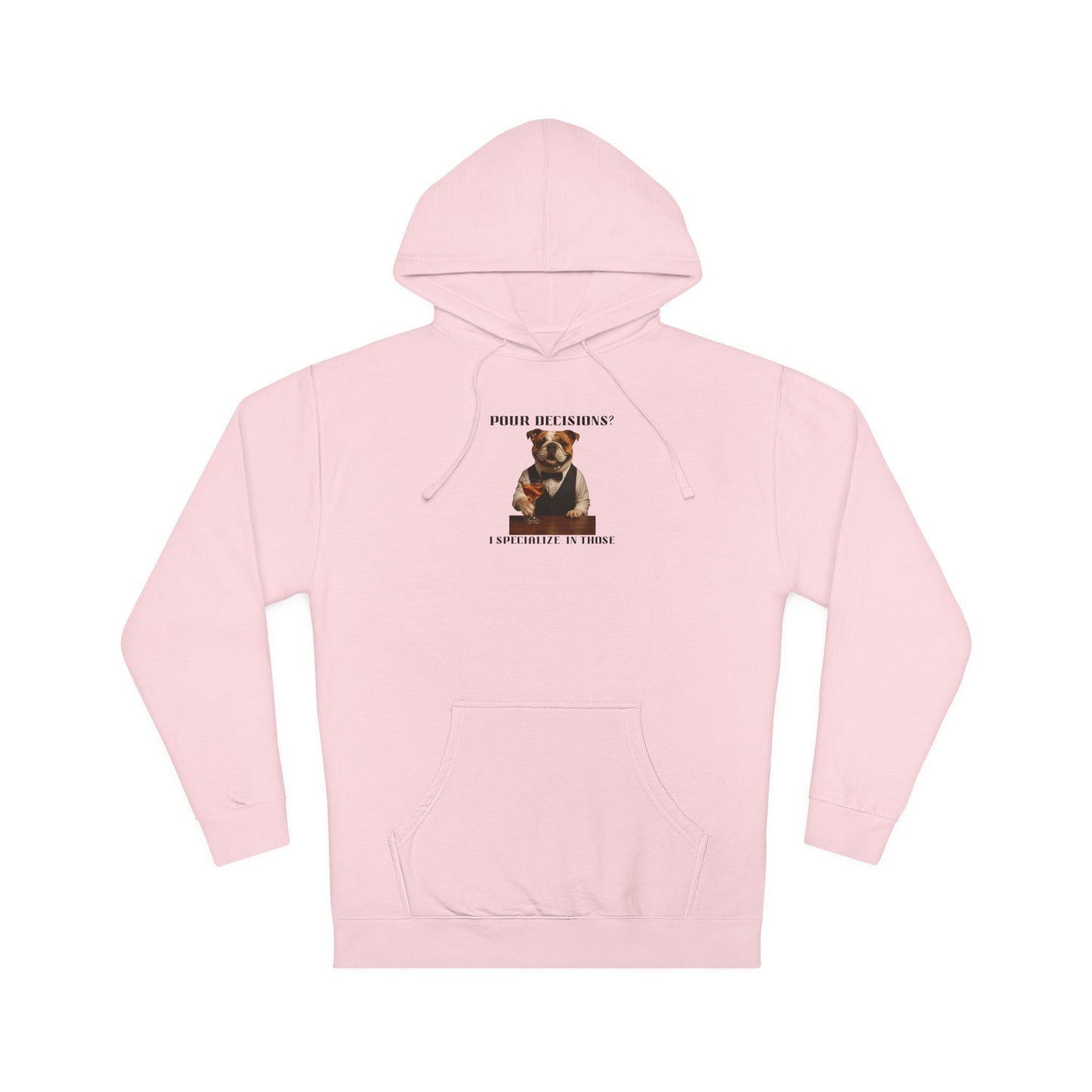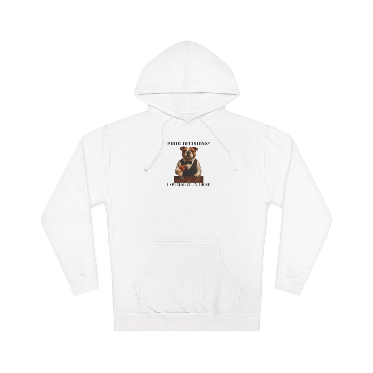 This humorous image features an anthropomorphic English Bulldog dressed in a formal vest and bowtie, seated at a bar and holding a cocktail glass. The dog appears to be a witty bartender, with the text "POUR DECISIONS?" playfully positioned above and "I SPECIALIZE IN THOSE" below. The bulldog has a characteristic wrinkled face and is smiling, giving the image a comedic and lighthearted tone. The photograph is styled like a professional portrait, with sharp details and a sleek composition that emphasizes the dog's human-like posture and attire. The meme-style image plays on the pun of "poor decisions" versus "pour decisions," suggesting the dog's expertise in mixing drinks and making questionable choices.Fantasy Dog Portraits