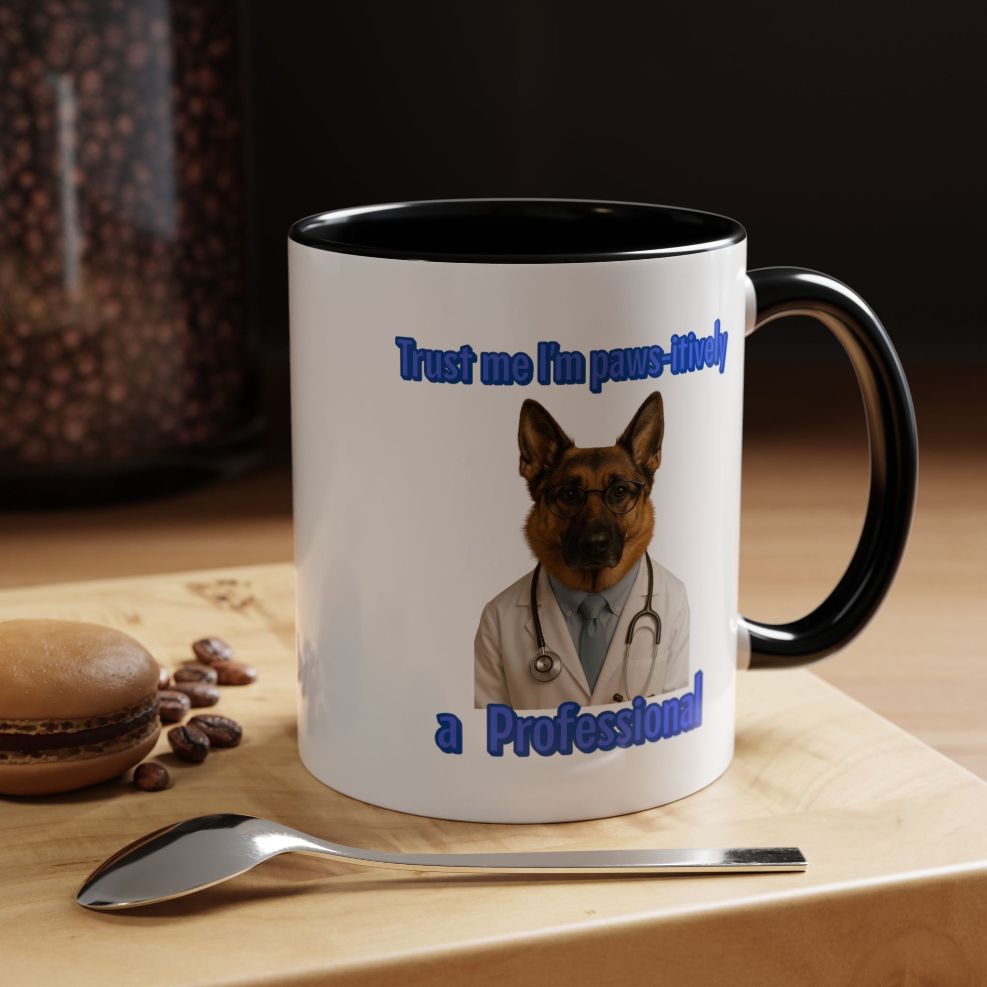 This hilarious and clever image features a German Shepherd dressed as a professional medical doctor, complete with a white lab coat, blue shirt and tie, stethoscope, and round glasses. The dog looks directly at the camera with a serious, professional expression against a black background. The text "Trust me I'm paws-itively a Professional" is displayed in bold blue letters, adding a playful pun to the humorous scene. The dog's fur is a rich golden-brown color, and the glasses perched on its nose give it an intellectual, authoritative appearance. The stethoscope draped around its neck adds to the medical professional aesthetic, making the image both amusing and endearing. The high-quality, studio-style photography captures every detail of the dog's fur and facial expression, enhancing the comedic effect. This image plays on the anthropomorphic trend of dressing animals in human professional attire, creating a memorable and shareable piece of visual humor. The crisp contrast between the black background and the dog's warm-toned fur and white coat makes the image pop. The clever wordplay in the text "paws-itively" adds an extra layer of humor to the already entertaining concept. Overall, the image is a delightful representation of creative pet photography that combines professional styling with playful comedy.