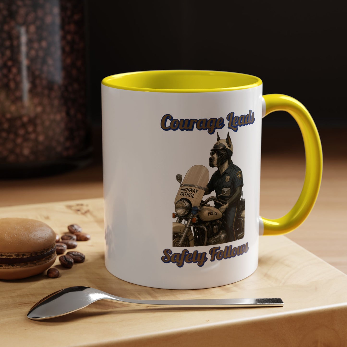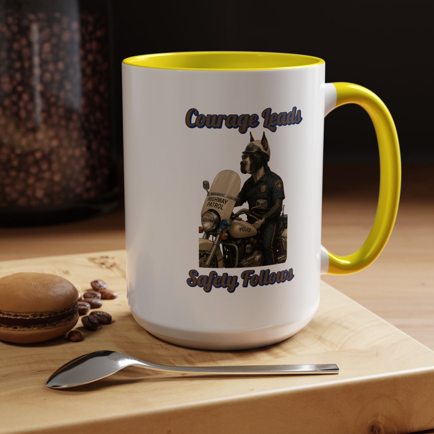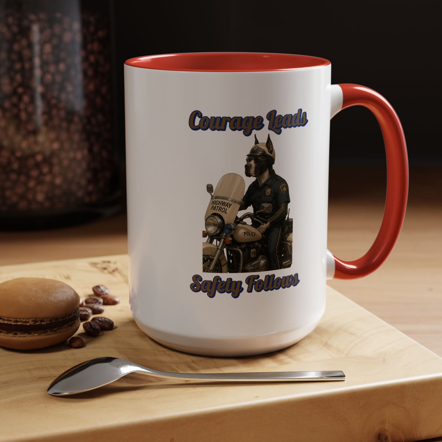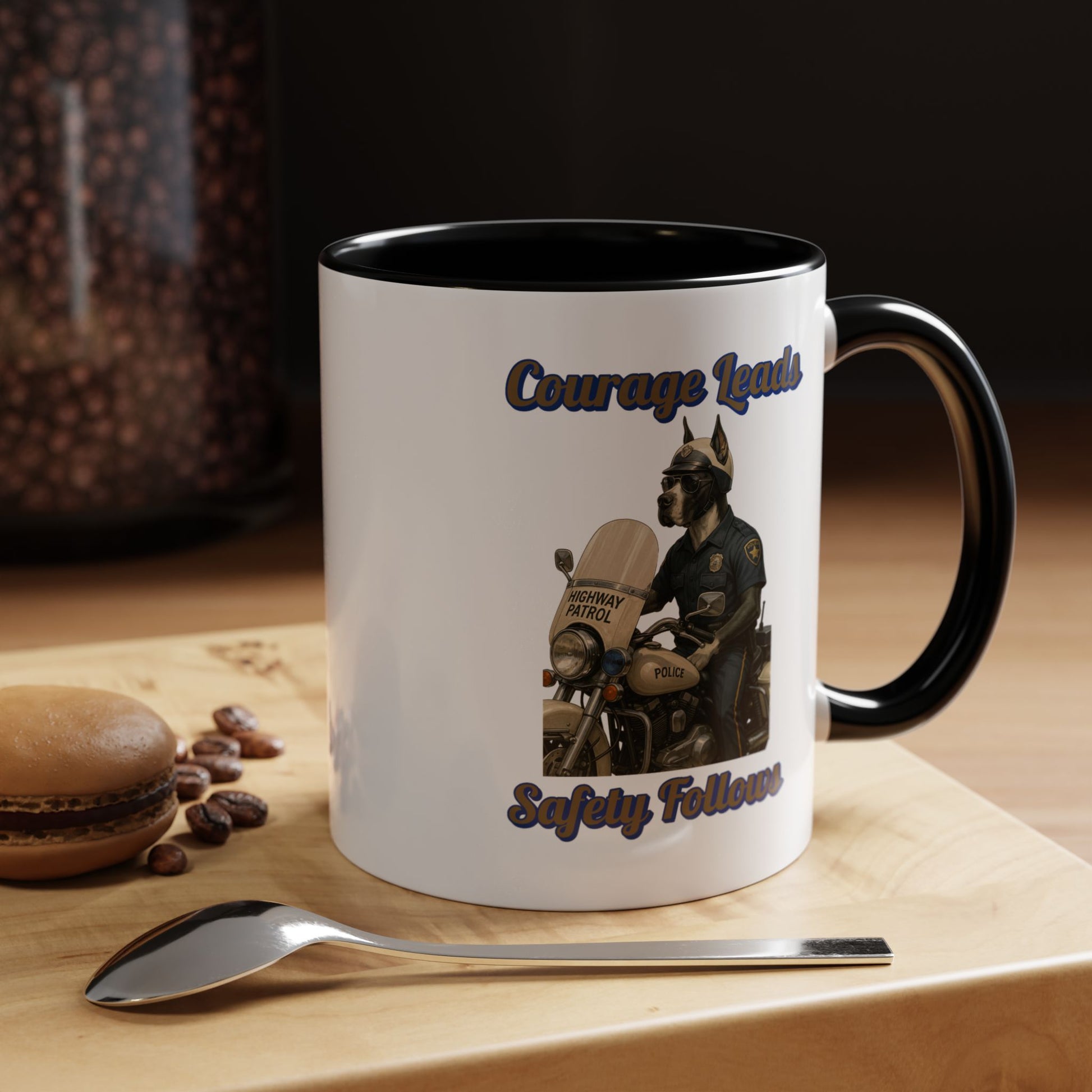 This striking artwork depicts an anthropomorphic dog as a highway patrol officer, symbolizing the message "Courage Leads, Safety Follows" in a powerful visual narrative. The image features a muscular canine figure dressed in a classic police uniform, complete with a cap, sunglasses, and badge, standing beside a vintage police motorcycle. The motorcycle, labeled "Highway Patrol," appears to be a classic model with chrome details and a prominent windshield, representing law enforcement's commitment to public safety. The dog's posture is authoritative and confident, embodying the qualities of courage, discipline, and protection associated with police work. The color palette is predominantly dark, with the motorcycle and uniform in shades of black, gray, and cream, creating a sense of professionalism and seriousness. The text "Courage Leads" and "Safety Follows" is rendered in bold, blue lettering, emphasizing the core message of leadership and protection. The artwork seems to be a digital illustration or painting, with intricate details that bring the anthropomorphic character to life. The background is a solid black, which draws full attention to the central figure and the motorcycle. This image serves as a metaphorical representation of law enforcement's role in maintaining public safety, using the dog as a symbol of loyalty, bravery, and vigilance. The overall composition suggests that courage and leadership are fundamental to ensuring the safety of communities.