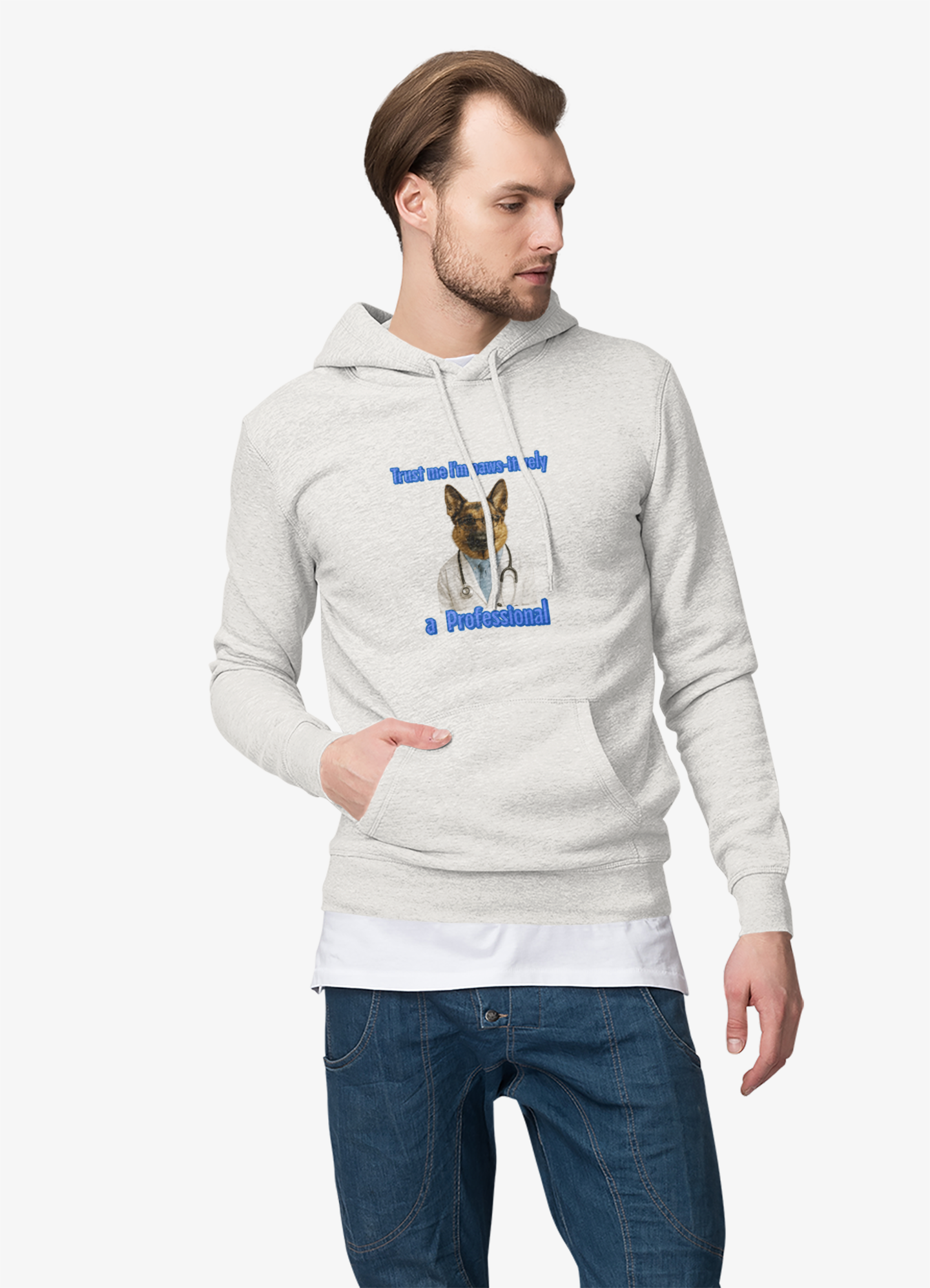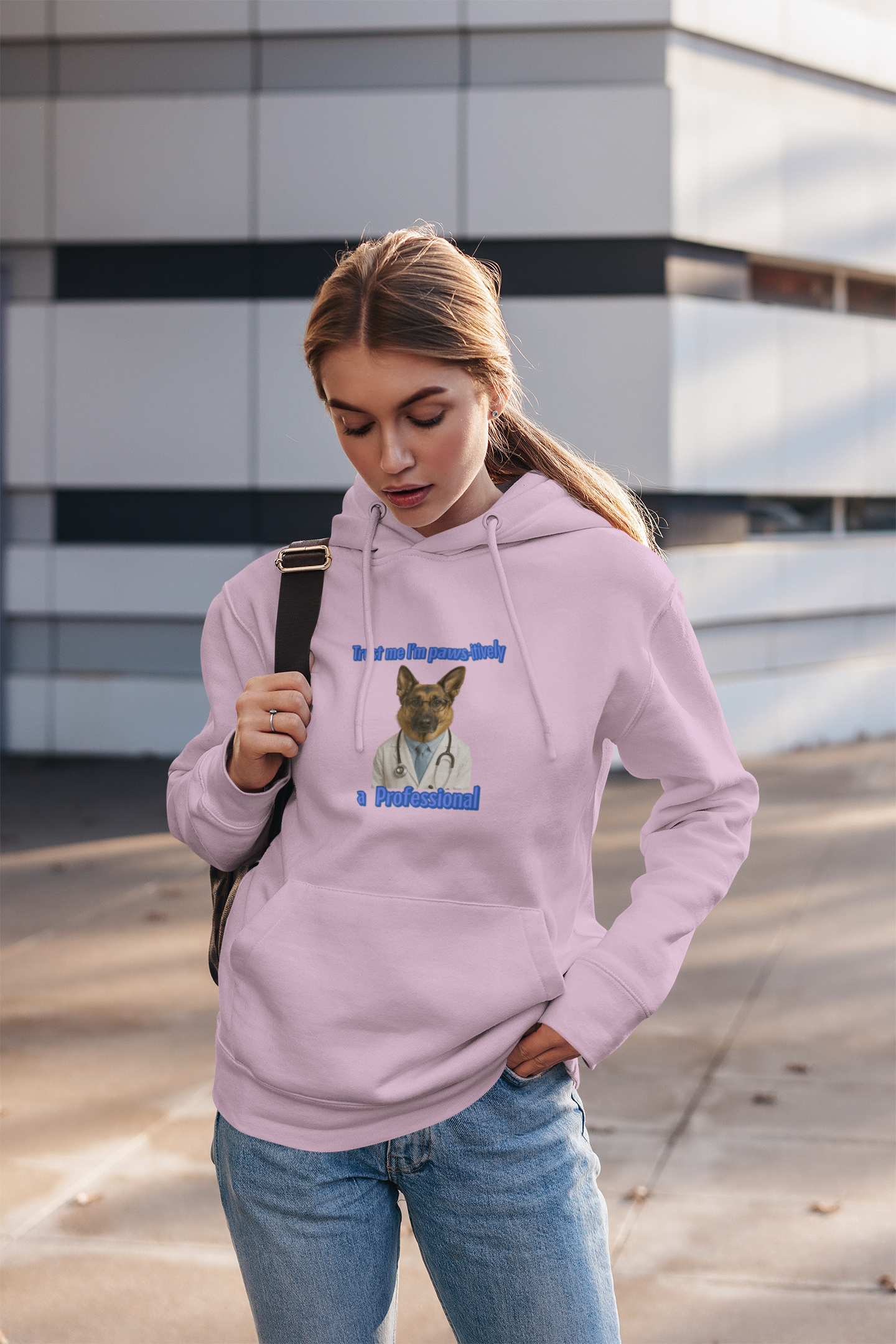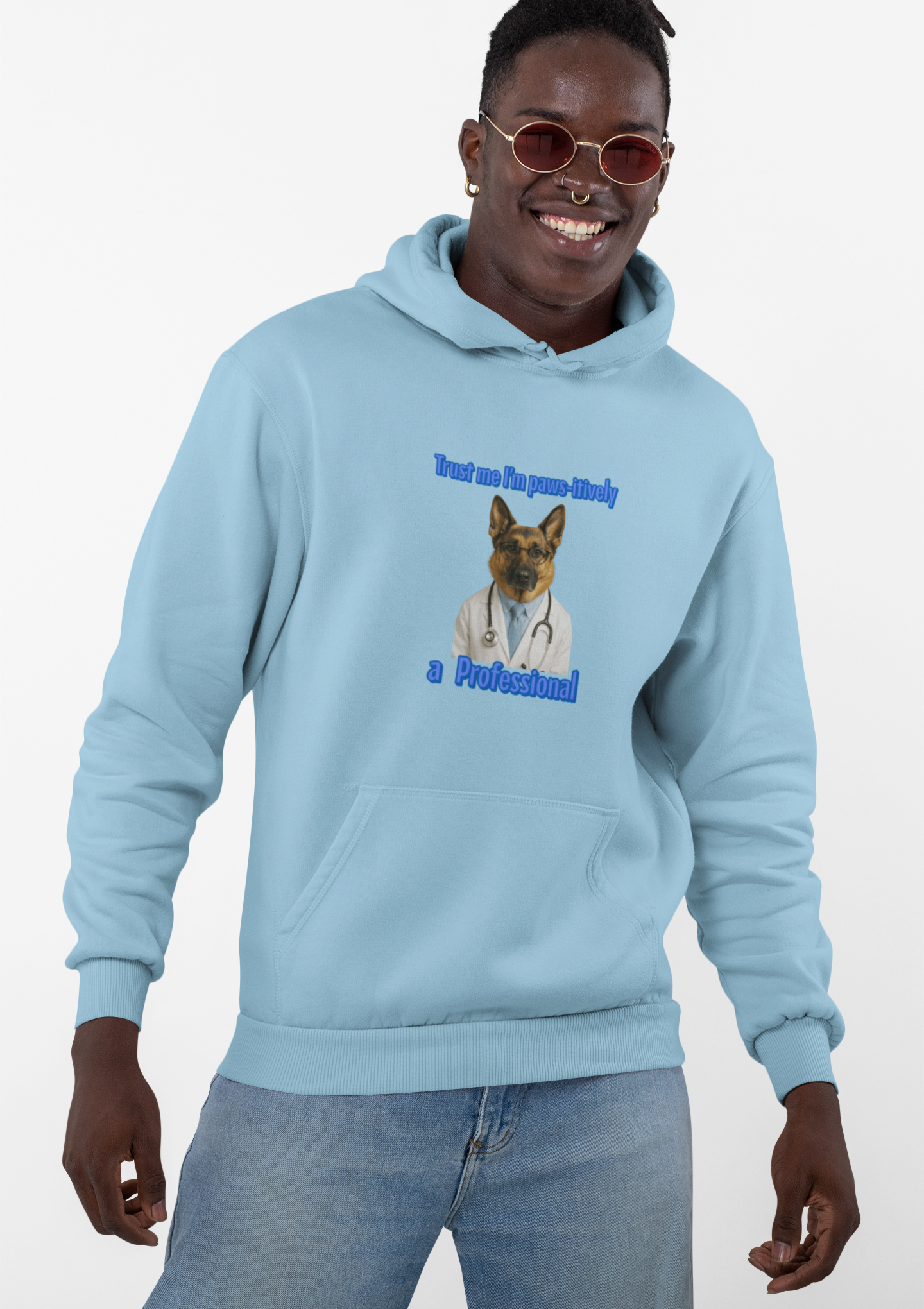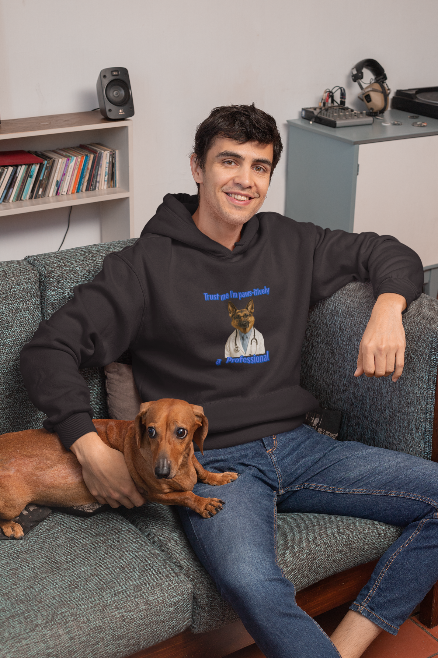 This humorous image features a German Shepherd dressed as a medical professional, complete with a white lab coat, blue tie, stethoscope, and round glasses. The dog's serious expression and professional attire create a comedic contrast that plays on the pun-filled text overlay reading "Trust me I'm paws-itively a Professional" in bold blue letters. The photograph is set against a pure black background, which dramatically highlights the dog's distinctive tan and black fur coloration and gives the image a studio-style quality. The dog's intelligent gaze and precise positioning make it appear as if this canine is ready to diagnose patients or conduct a medical consultation. The play on words in the text adds a lighthearted touch to the otherwise serious professional styling, creating an amusing visual joke about workplace roles. The high-quality photographic technique captures intricate details like the dog's fur texture, the stethoscope's metallic sheen, and the crisp lines of the professional attire. This image cleverly anthropomorphizes the German Shepherd, giving it a human-like professional persona while maintaining the inherent charm and personality of the dog breed. The combination of professional styling and canine subject creates a memorable and shareable meme-like image that is likely to generate humor and entertainment. The precise styling and professional presentation suggest a skilled photographer who understands both animal photography and comedic visual storytelling. Overall, the image is a delightful and witty representation of professional humor that plays with expectations and brings a smile to viewers.Fantasy Dog Portraits