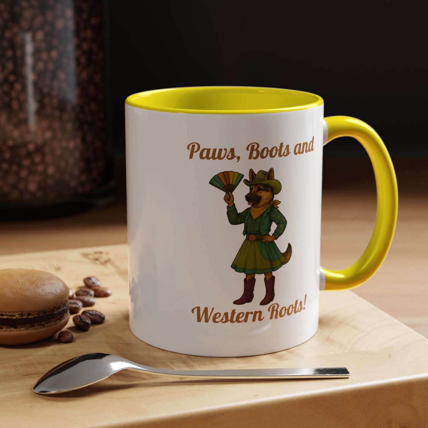 Paws, Boots and Western Roots!" is a whimsical digital illustration featuring an anthropomorphic dog dressed in a stylish Western-inspired outfit. The canine character wears a green wide-brimmed hat, a teal and green patterned jacket, and a flowing green skirt cinched with a yellow belt. Completing the ensemble are vibrant purple cowboy boots and a matching yellow bandana around the neck. The dog is playfully posing with a multi-colored folding fan, adding a touch of flair to the already dynamic composition. The artwork is set against a stark black background, which makes the colorful character stand out dramatically. The illustration blends elements of Western fashion, vintage poster design, and playful animal characterization. The text at the top and bottom of the image uses a retro-style font that complements the overall vintage aesthetic. This image appears to celebrate a fun, creative reimagining of Western style through an anthropomorphic lens. The attention to detail in the clothing, pose, and color palette creates a charming and memorable visual narrative. The artwork invites viewers to appreciate the imaginative blend of animal portraiture and cultural fashion styling.