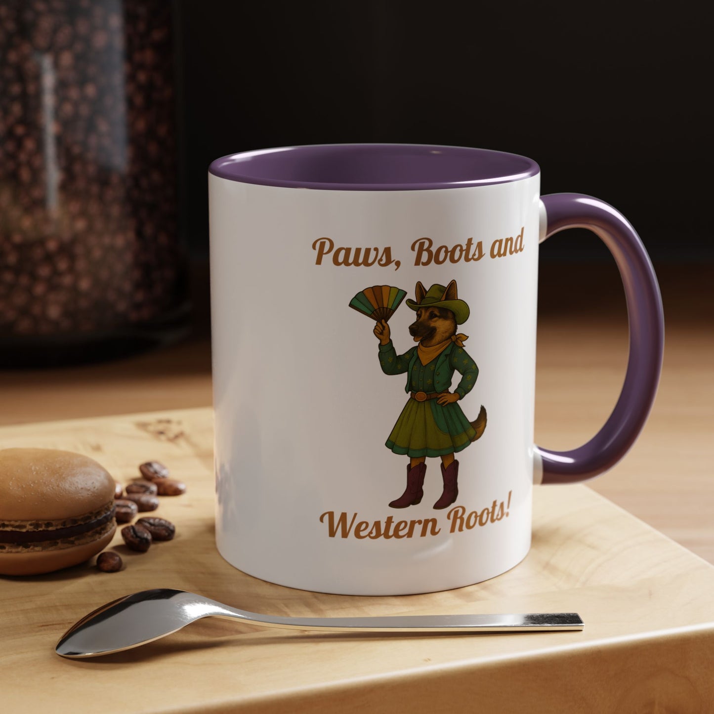 Paws, Boots and Western Roots!" is a whimsical digital illustration featuring an anthropomorphic dog dressed in a stylish Western-inspired outfit. The canine character wears a green wide-brimmed hat, a teal and green patterned jacket, and a flowing green skirt cinched with a yellow belt. Completing the ensemble are vibrant purple cowboy boots and a matching yellow bandana around the neck. The dog is playfully posing with a multi-colored folding fan, adding a touch of flair to the already dynamic composition. The artwork is set against a stark black background, which makes the colorful character stand out dramatically. The illustration blends elements of Western fashion, vintage poster design, and playful animal characterization. The text at the top and bottom of the image uses a retro-style font that complements the overall vintage aesthetic. This image appears to celebrate a fun, creative reimagining of Western style through an anthropomorphic lens. The attention to detail in the clothing, pose, and color palette creates a charming and memorable visual narrative. The artwork invites viewers to appreciate the imaginative blend of animal portraiture and cultural fashion styling.