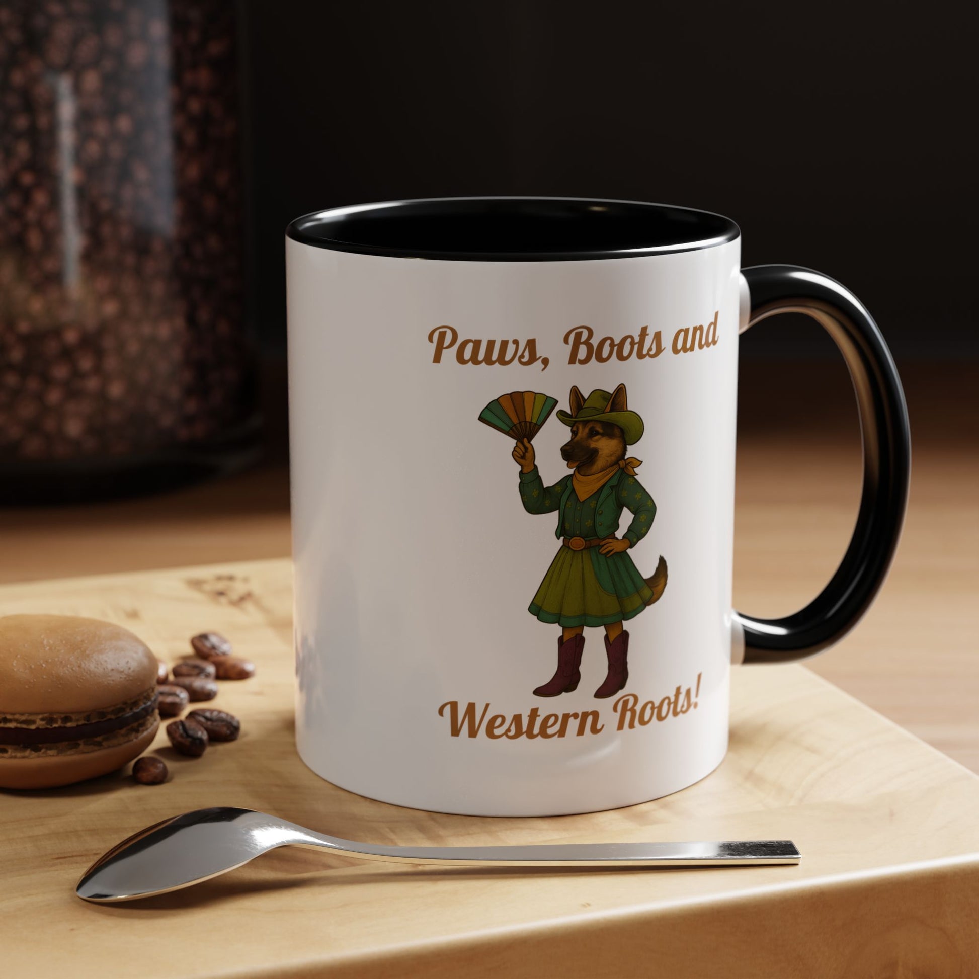 Paws, Boots and Western Roots!" is a whimsical digital illustration featuring an anthropomorphic dog dressed in a stylish Western-inspired outfit. The canine character wears a green wide-brimmed hat, a teal and green patterned jacket, and a flowing green skirt cinched with a yellow belt. Completing the ensemble are vibrant purple cowboy boots and a matching yellow bandana around the neck. The dog is playfully posing with a multi-colored folding fan, adding a touch of flair to the already dynamic composition. The artwork is set against a stark black background, which makes the colorful character stand out dramatically. The illustration blends elements of Western fashion, vintage poster design, and playful animal characterization. The text at the top and bottom of the image uses a retro-style font that complements the overall vintage aesthetic. This image appears to celebrate a fun, creative reimagining of Western style through an anthropomorphic lens. The attention to detail in the clothing, pose, and color palette creates a charming and memorable visual narrative. The artwork invites viewers to appreciate the imaginative blend of animal portraiture and cultural fashion styling.