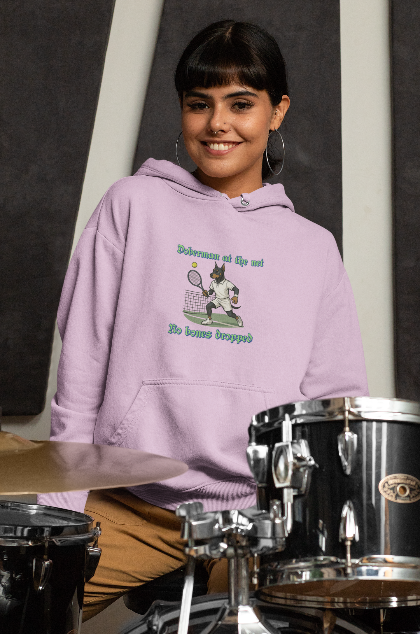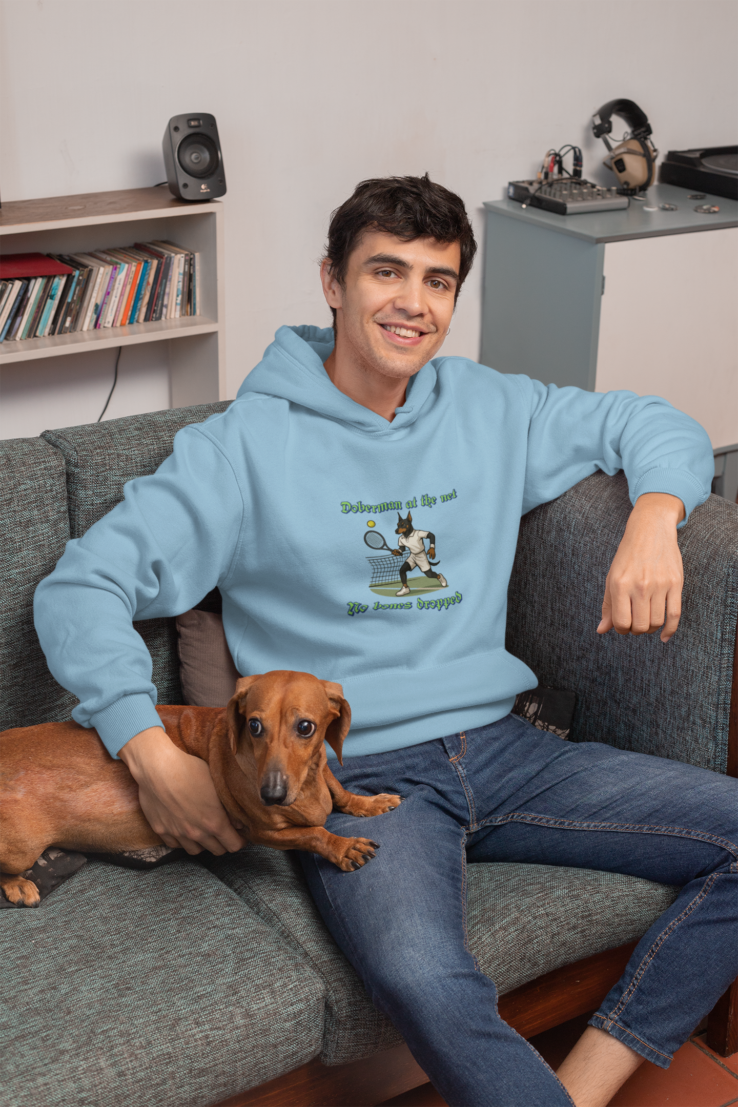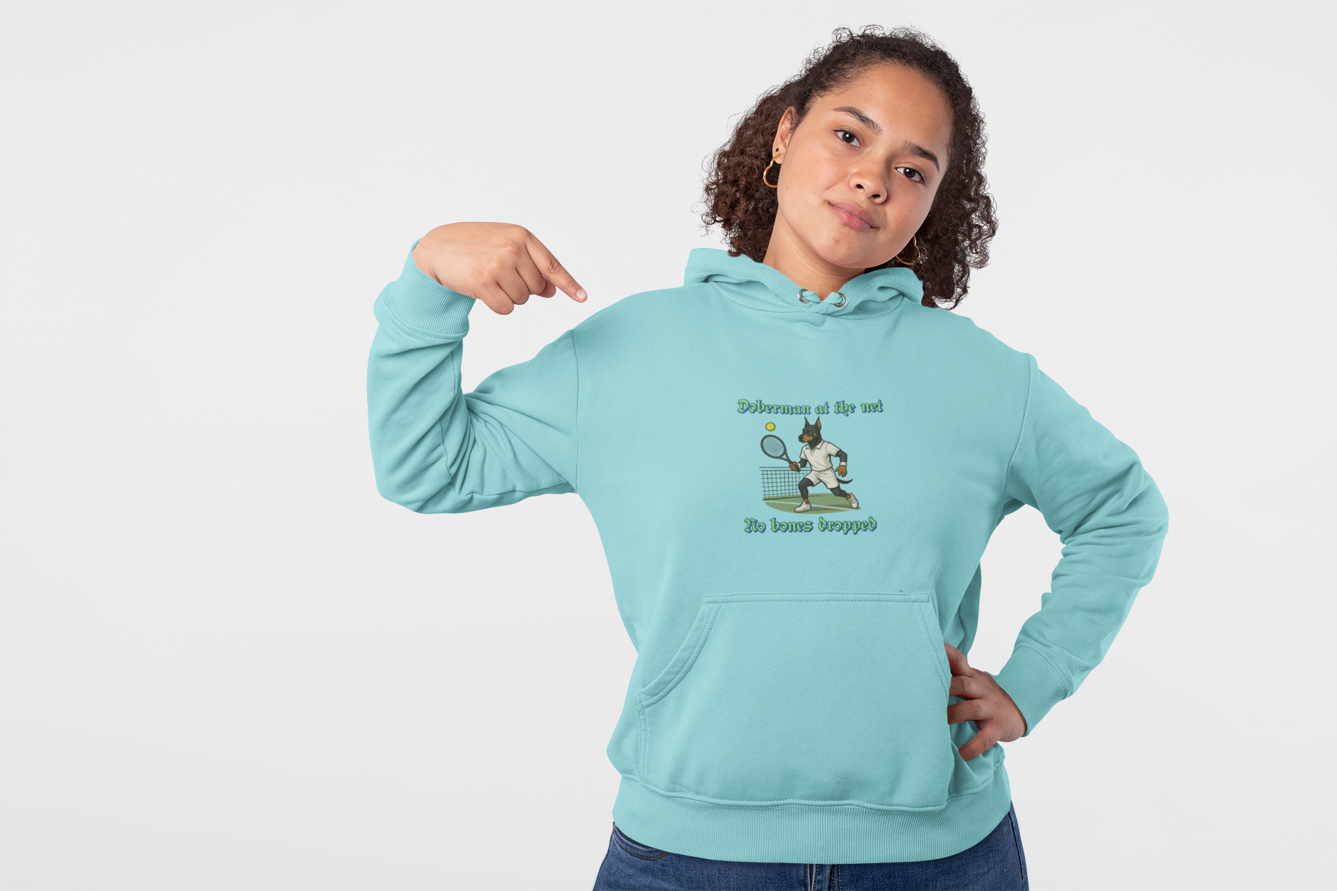 This playful graphic features a Doberman Pinscher anthropomorphized as a tennis player, dressed in classic white tennis attire and holding a tennis racket on a green court. The image is styled with a pixelated, retro-game aesthetic, with text rendered in a nostalgic, digital font that reads "Doberman at the net" and "No bones dropped" at the top and bottom of the image. The Doberman is depicted mid-action, poised to hit a yellow tennis ball, with a net and court lines visible in the background. The dog's athletic stance and professional tennis outfit create a humorous contrast with its canine nature, suggesting skill and determination. The black background enhances the graphic's visual impact, drawing focus to the stylized character and text. The color palette of green, blue, white, and black gives the image a cool, modern feel while maintaining a playful tone. The illustration cleverly plays on the athletic reputation of Doberman Pinschers, known for their agility and intensity. The pixelated text and graphic style evoke memories of early video games and computer graphics. Overall, the image is a creative and witty representation of a dog reimagined as a professional tennis player, blending humor, sports, and nostalgic graphic design.Fantasy Dog Portraits