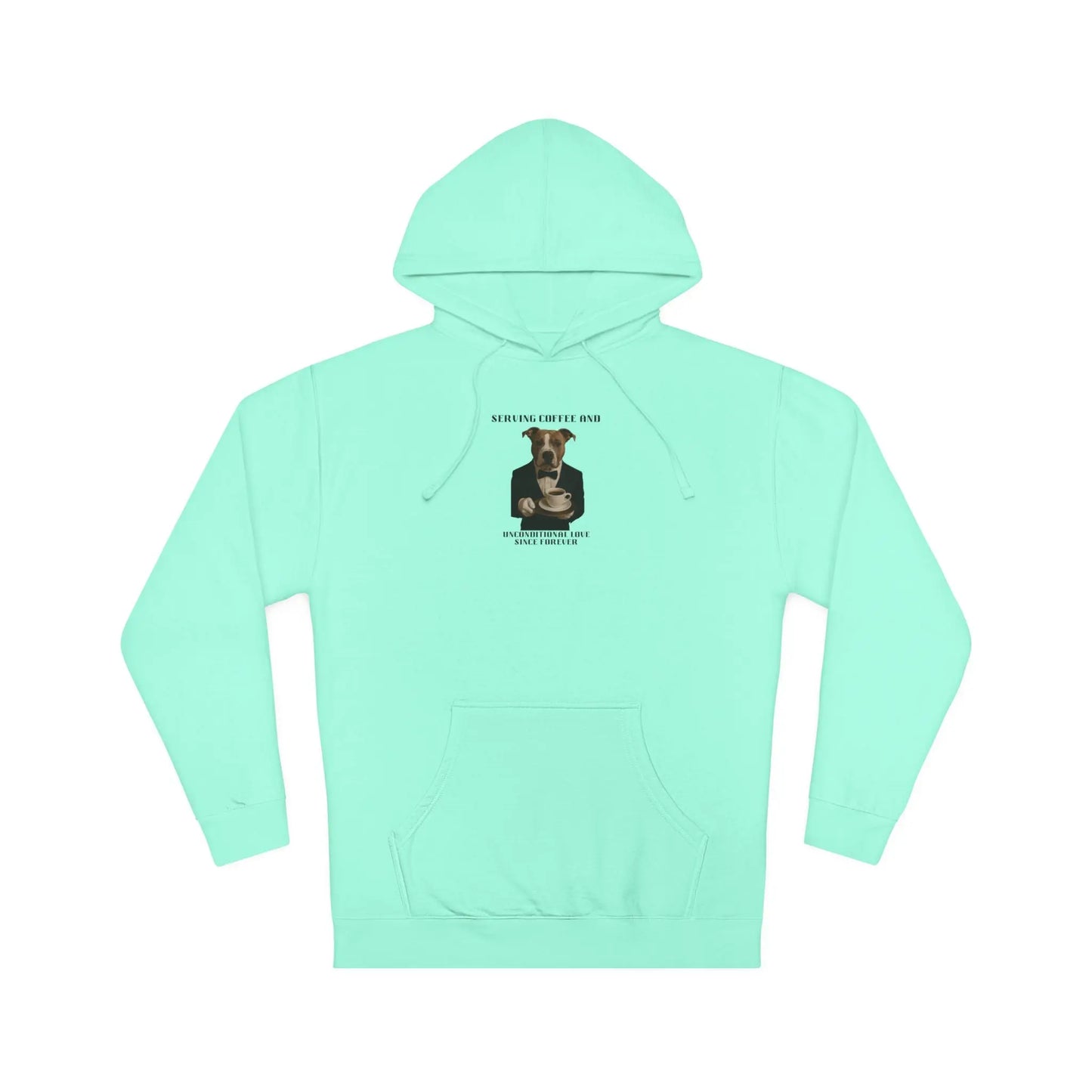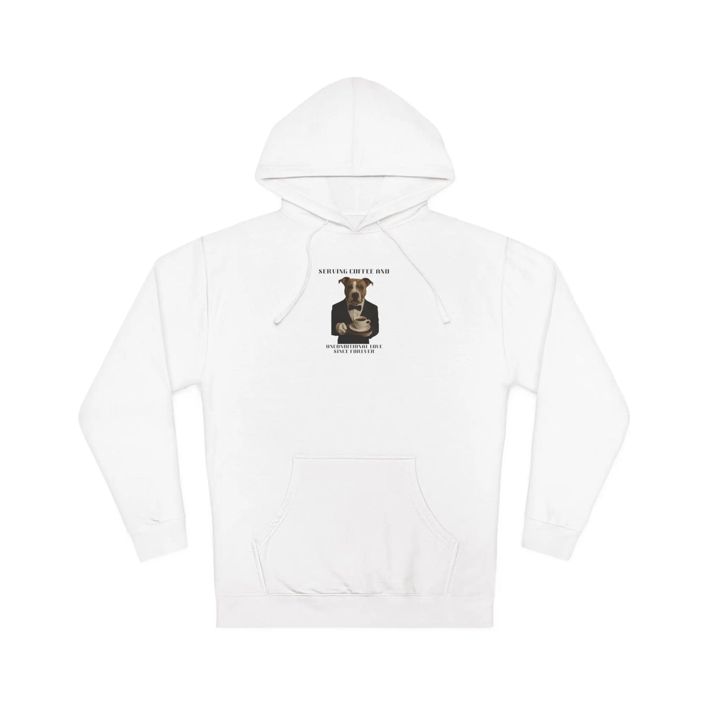 This humorous image features a pit bull-type dog dressed in a formal white tuxedo and bow tie, styled as an elegant server or waiter. The dog is holding a coffee cup and saucer, creating a whimsical anthropomorphic scene that plays on the text "Serving Coffee and Unconditional Love Since Forever". The photograph is a creative digital manipulation that combines a realistic dog portrait with a stylized human body, giving the canine a sophisticated and charming appearance. Bold, dramatic typography frames the top and bottom of the image, emphasizing the playful concept of a dog as a dedicated coffee server. The image cleverly highlights the loyal and loving nature of dogs through this amusing visual metaphor of service and companionship.Fantasy Dog Portraits