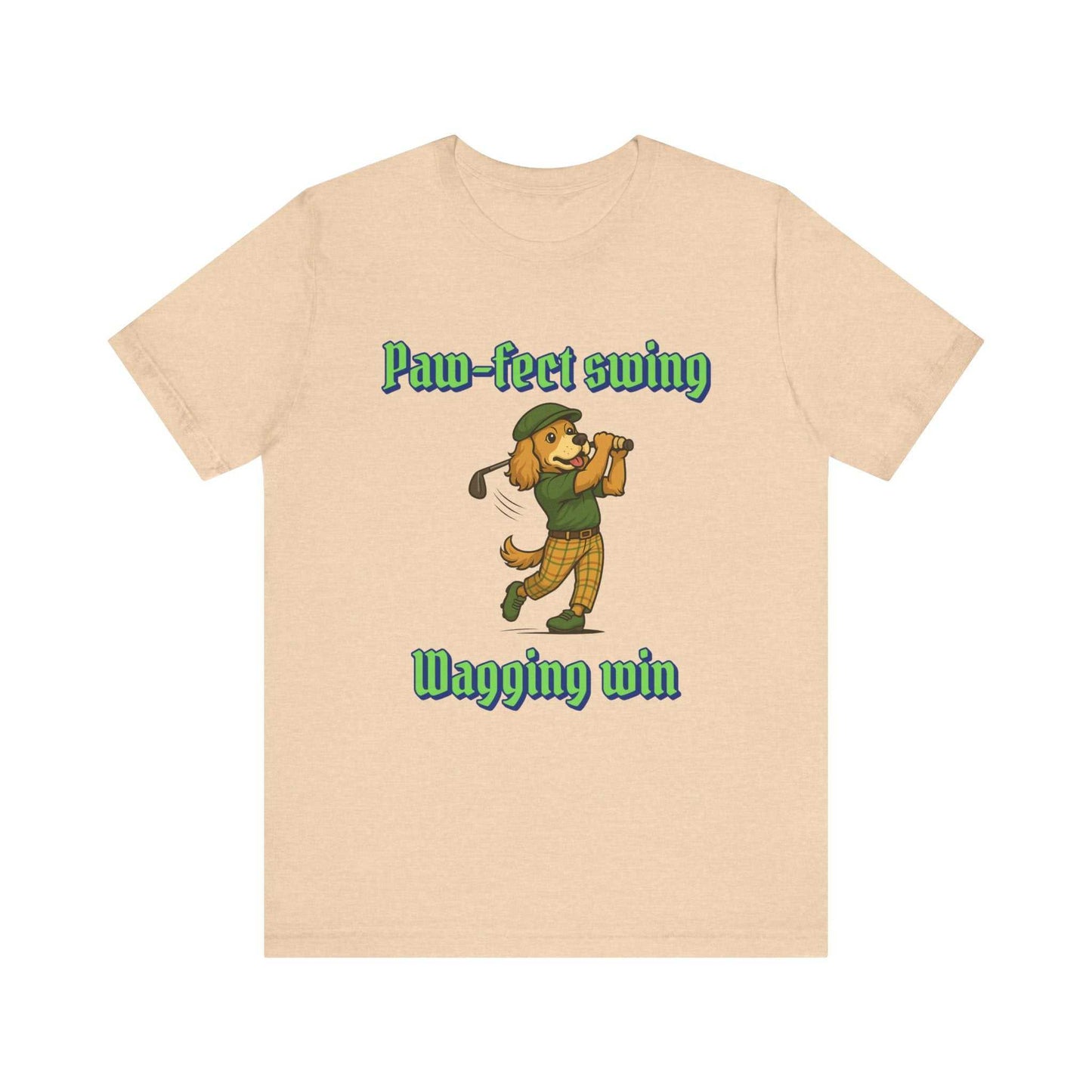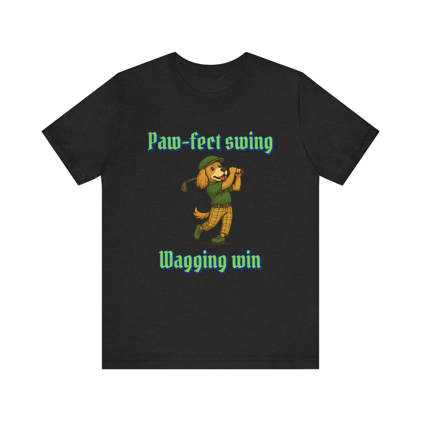 Discover the delightful world of golfing canine charm with this whimsical illustration featuring a playful dog golfer. The adorable cartoon character is dressed in a classic green top and yellow plaid pants, capturing the essence of golf fashion with a cute twist. Wielding a golf club mid-swing, the dog demonstrates perfect form with a joyful expression, embodying the spirit of the game. The punny text "Paw-feet swing" and "Wagging win" adds a humorous touch to the already endearing image. Set against a black background, the illustration stands out with its vibrant colors and charming details. The dog's golden fur and friendly demeanor bring a smile to viewers' faces, making this image a perfect representation of fun and enthusiasm in sports. The artistic style combines cartoon-like elements with a realistic golf pose, creating a unique and entertaining visual. This image is sure to appeal to golf enthusiasts, dog lovers, and anyone who appreciates clever, lighthearted artwork. The playful design suggests that golf can be enjoyable for everyone, even our four-legged friends. With its witty wordplay and adorable character, this illustration captures the joy and spirit of golf in a truly memorable way.Fantasy Dog Portraits