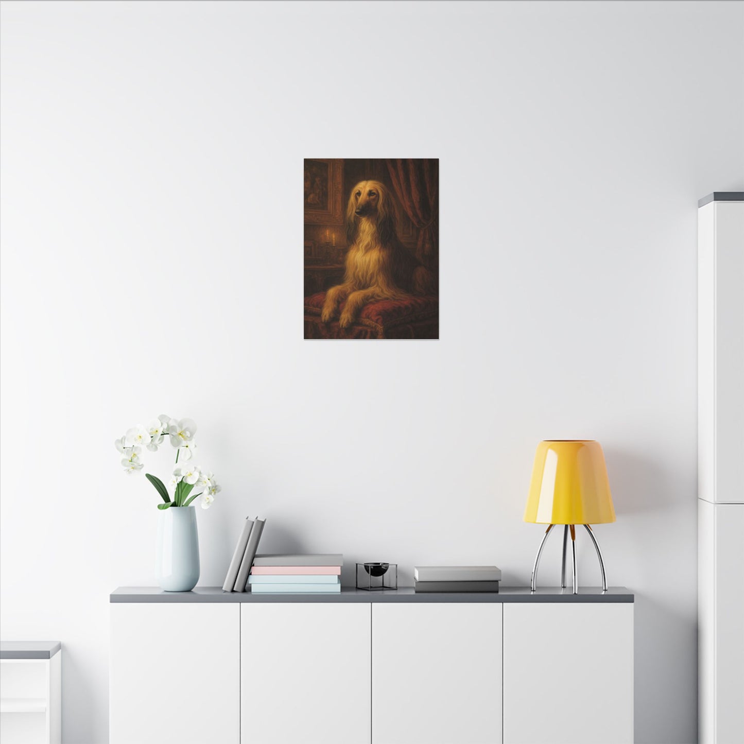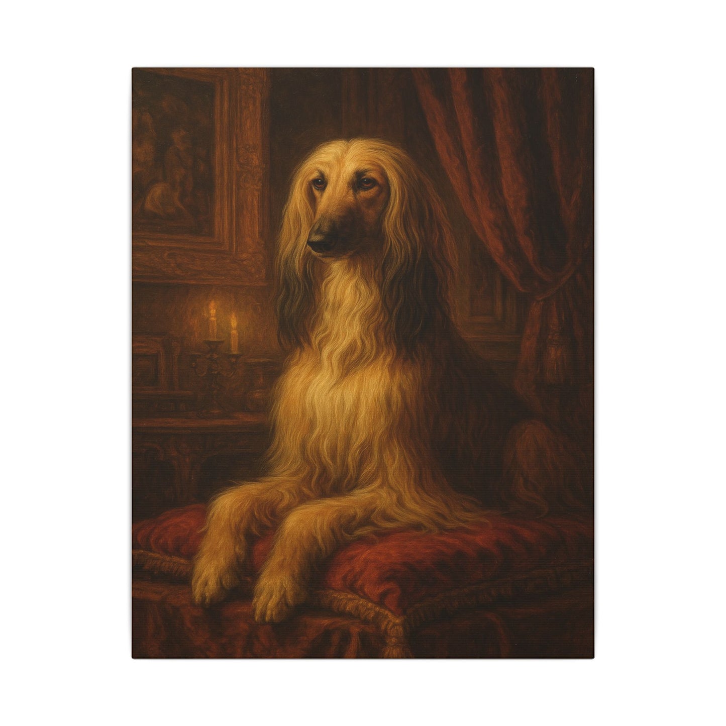 This exquisite portrait captures an Afghan Hound in a classic, regal setting, reminiscent of traditional aristocratic pet portraiture. The dog's magnificent golden-blonde coat cascades luxuriously, highlighting the breed's distinctive long, silky fur and elegant bone structure. Positioned against a rich, warm-toned background with wooden paneling and draped curtains, the hound sits on a plush red fabric, creating a sense of timeless sophistication. A soft candlelight flickers in the background, adding depth and creating a moody, almost painterly atmosphere that enhances the dog's noble bearing. The animal's expressive eyes gaze directly at the viewer with a sense of quiet intelligence and dignified composure. The intricate details of the painting, from the subtle variations in the dog's fur to the textured background, showcase remarkable artistic skill and attention to composition. The warm color palette of golden, amber, and deep red tones creates a harmonious and inviting visual experience. The portrait elevates the Afghan Hound from a mere pet to a subject of artistic contemplation, highlighting the breed's inherent grace and beauty. Reminiscent of 18th and 19th-century portrait styles, the painting celebrates the timeless bond between humans and their canine companions. The masterful technique and emotional depth of the artwork invite viewers to pause and appreciate the quiet majesty of this magnificent creature.