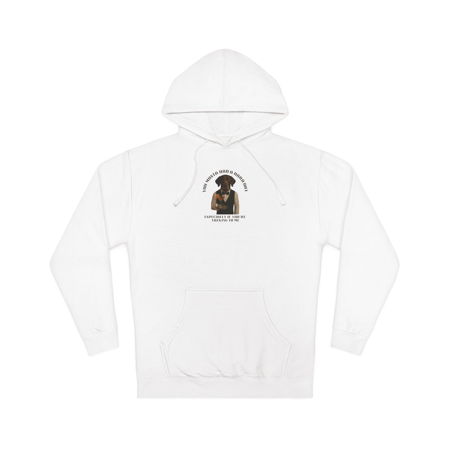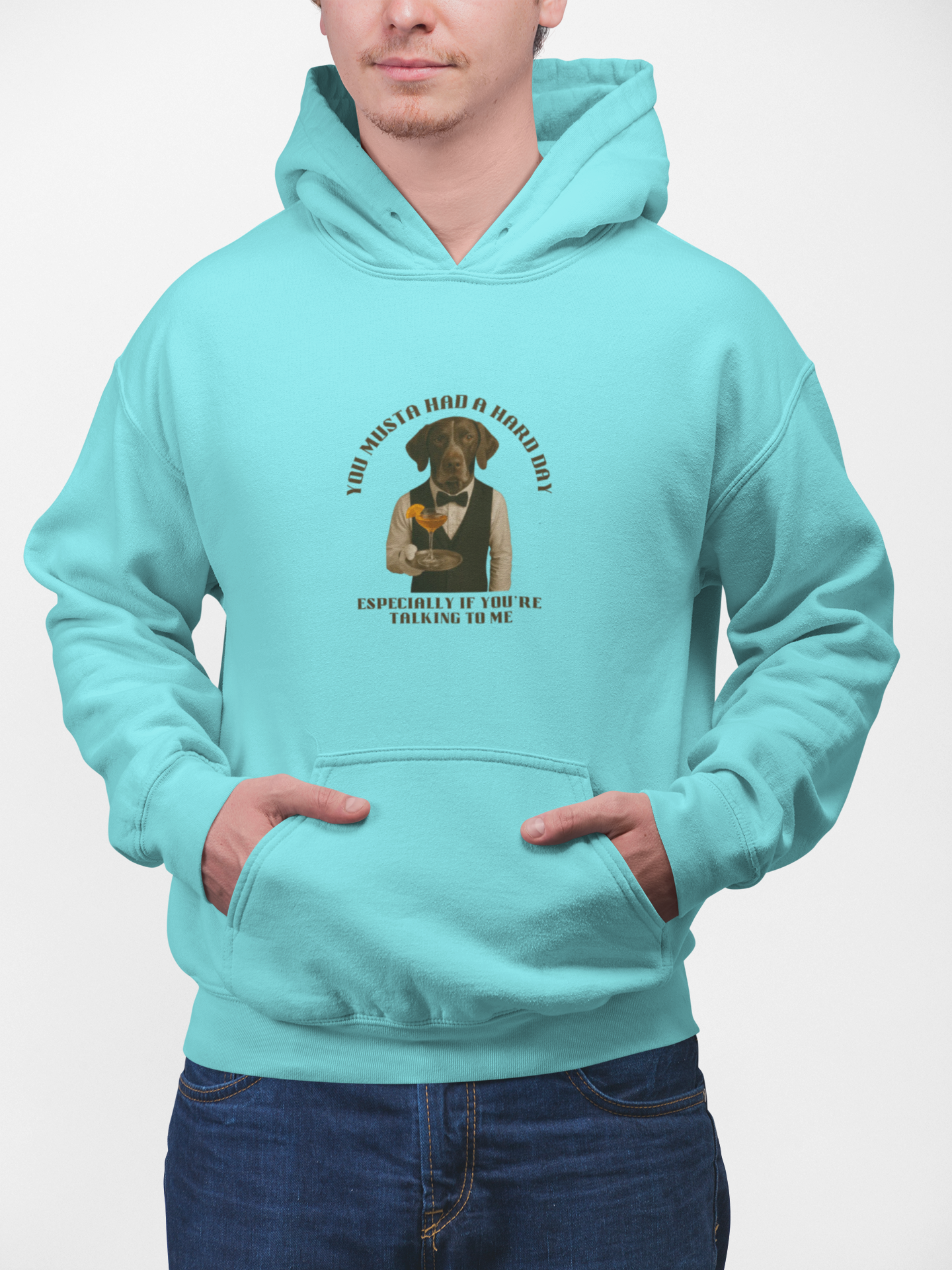 This humorous vintage-style poster features a sophisticated Labrador retriever dressed in a formal tuxedo and bow tie, holding a classic cocktail on a serving tray. The image is a playful anthropomorphic portrait of a dog styled as an elegant bartender or server, complete with a crisp white shirt and black vest. Text arches above and below the image, reading "YOU MUSTA HAD A HARD DAY" and "ESPECIALLY IF YOU'RE TALKING TO ME", giving the poster a witty, tongue-in-cheek message. The cocktail appears to be an orange-hued martini or similar drink, garnished with an orange slice, adding to the sophisticated aesthetic. The illustration blends photographic elements with graphic design, creating a stylized and whimsical representation of a canine mixologist.Fantasy Dog Portraits