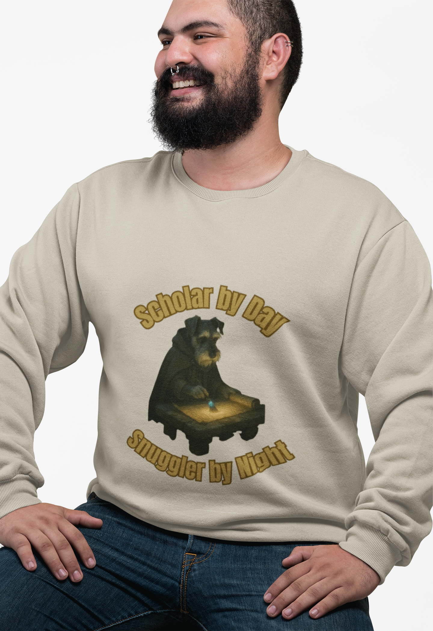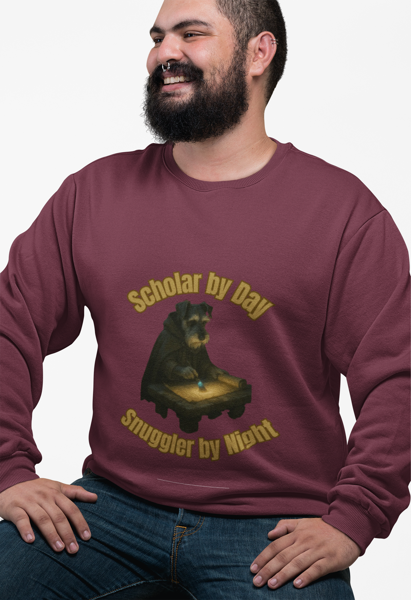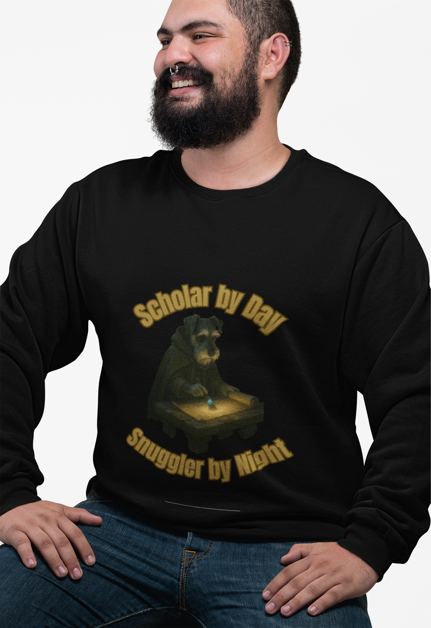 This whimsical illustration features a schnauzer-like dog dressed in scholarly attire, hunched over an ancient-looking scroll or document. The image appears to be a playful take on academic pursuit, with the canine character engaging in studious activity. The dog is positioned on a textured surface, seemingly deep in concentration while examining the text before them. Text surrounds the central image, reading "Scholar by Day, Smuggler by Night," suggesting a humorous narrative about the character's dual identity. The artwork blends photographic and illustrative styles, creating a surreal and engaging visual that anthropomorphizes the dog in an imaginative scholarly setting.Fantasy Dog Portraits