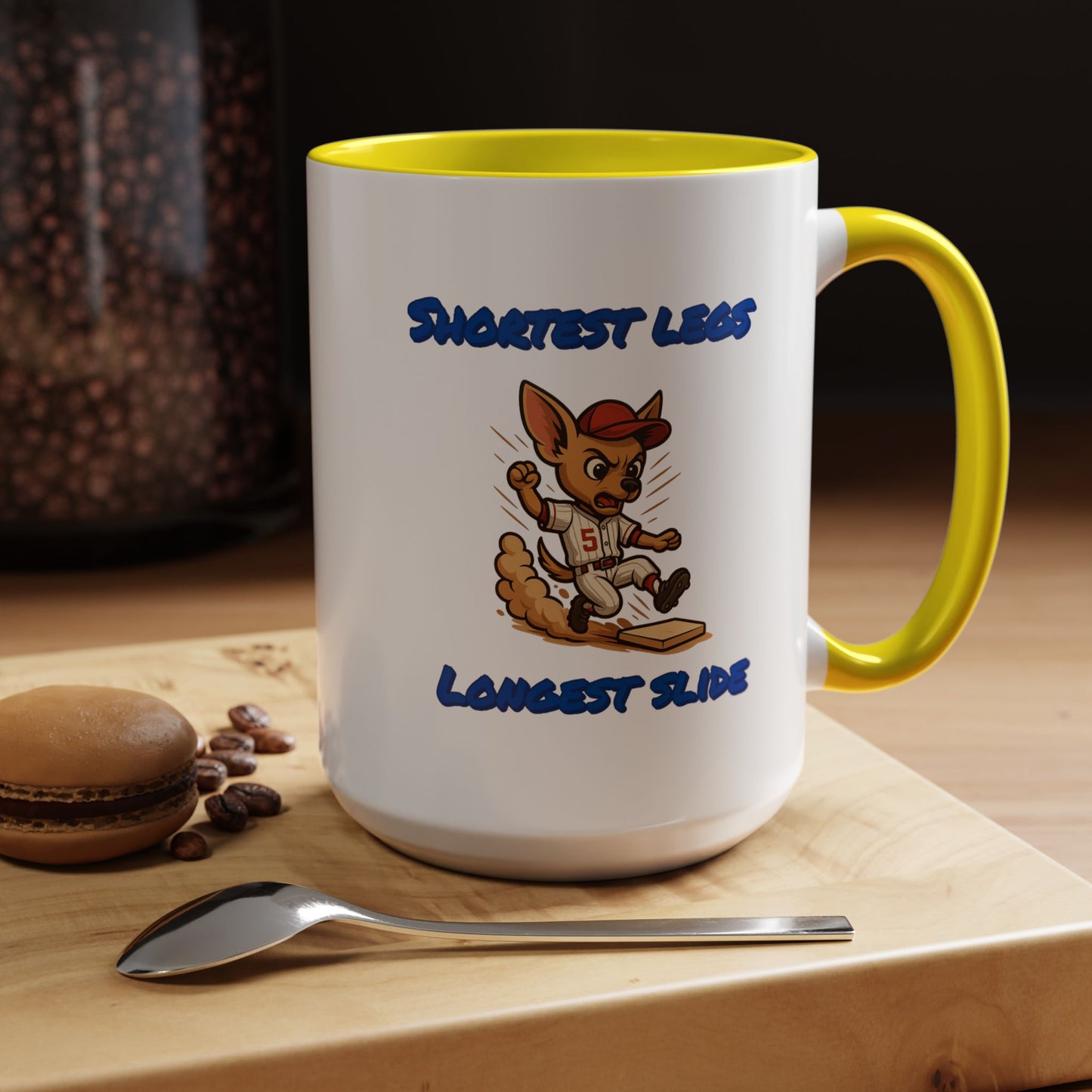 The image depicts a cartoon baseball-playing canine character sliding into a base with intense determination. Titled "Shortest Legs, Longest Slide", the graphic showcases a small dog wearing a white baseball uniform with the number 5 and a red cap. The character is mid-slide, kicking up a cloud of dust and displaying a fierce, focused expression. Stylized speed lines emphasize the dynamic motion of the slide, creating a sense of energy and movement. The illustration is set against a black background, making the blue title text and the yellow-orange dust cloud stand out vividly. The character's proportions are exaggerated for comedic effect, with particularly short legs contrasting with the dramatic sliding pose. The artwork has a playful, cartoon-like style that combines humor with athletic intensity. The blue text at the top and bottom of the image adds a punchy, graphic novel-esque quality to the design. This image appears to be a humorous take on baseball, highlighting the underdog spirit and determination of the small but mighty protagonist.
