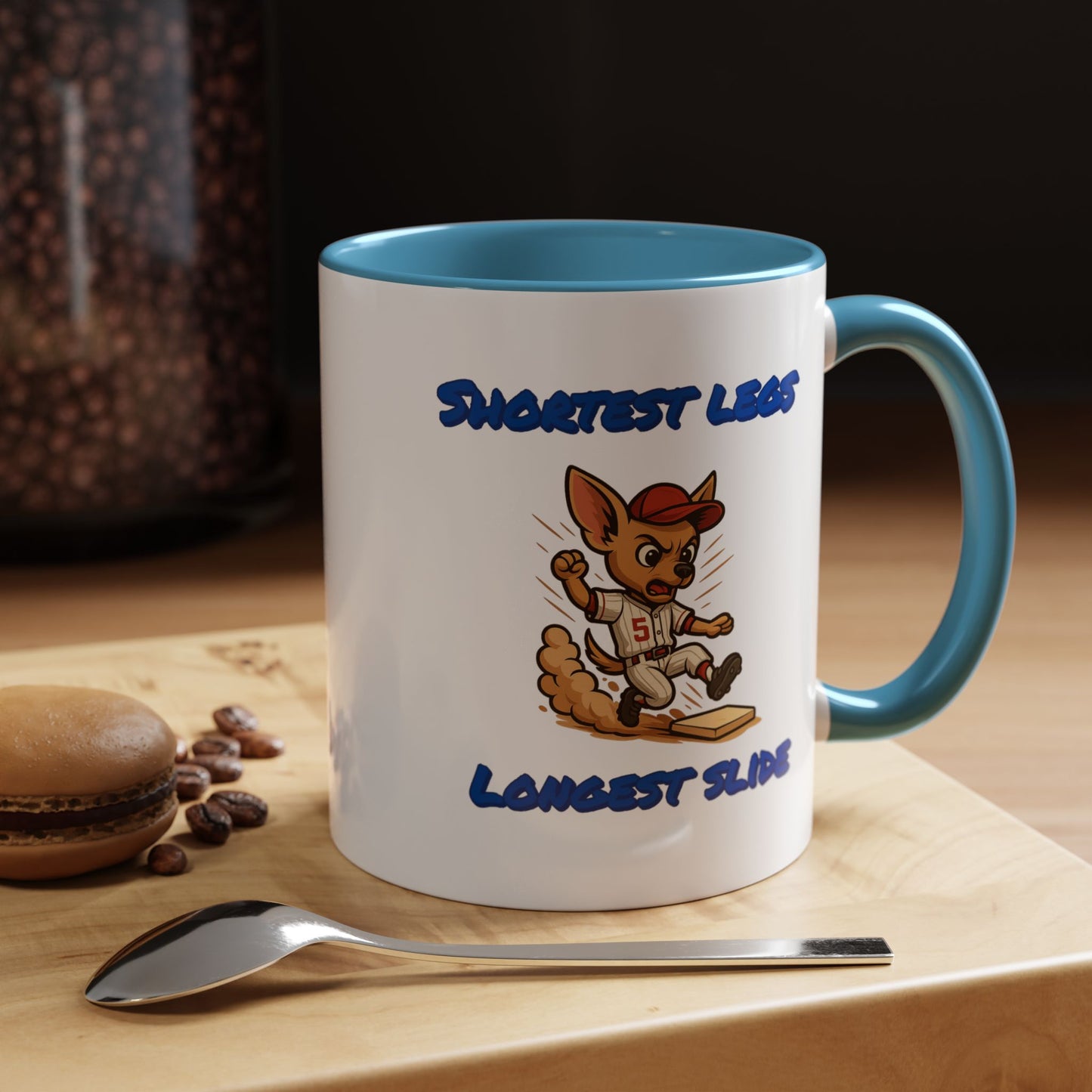 The image depicts a cartoon baseball-playing canine character sliding into a base with intense determination. Titled "Shortest Legs, Longest Slide", the graphic showcases a small dog wearing a white baseball uniform with the number 5 and a red cap. The character is mid-slide, kicking up a cloud of dust and displaying a fierce, focused expression. Stylized speed lines emphasize the dynamic motion of the slide, creating a sense of energy and movement. The illustration is set against a black background, making the blue title text and the yellow-orange dust cloud stand out vividly. The character's proportions are exaggerated for comedic effect, with particularly short legs contrasting with the dramatic sliding pose. The artwork has a playful, cartoon-like style that combines humor with athletic intensity. The blue text at the top and bottom of the image adds a punchy, graphic novel-esque quality to the design. This image appears to be a humorous take on baseball, highlighting the underdog spirit and determination of the small but mighty protagonist.