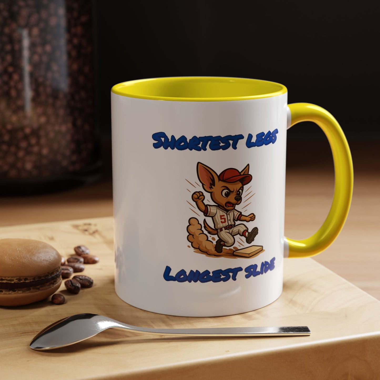 The image depicts a cartoon baseball-playing canine character sliding into a base with intense determination. Titled "Shortest Legs, Longest Slide", the graphic showcases a small dog wearing a white baseball uniform with the number 5 and a red cap. The character is mid-slide, kicking up a cloud of dust and displaying a fierce, focused expression. Stylized speed lines emphasize the dynamic motion of the slide, creating a sense of energy and movement. The illustration is set against a black background, making the blue title text and the yellow-orange dust cloud stand out vividly. The character's proportions are exaggerated for comedic effect, with particularly short legs contrasting with the dramatic sliding pose. The artwork has a playful, cartoon-like style that combines humor with athletic intensity. The blue text at the top and bottom of the image adds a punchy, graphic novel-esque quality to the design. This image appears to be a humorous take on baseball, highlighting the underdog spirit and determination of the small but mighty protagonist.
