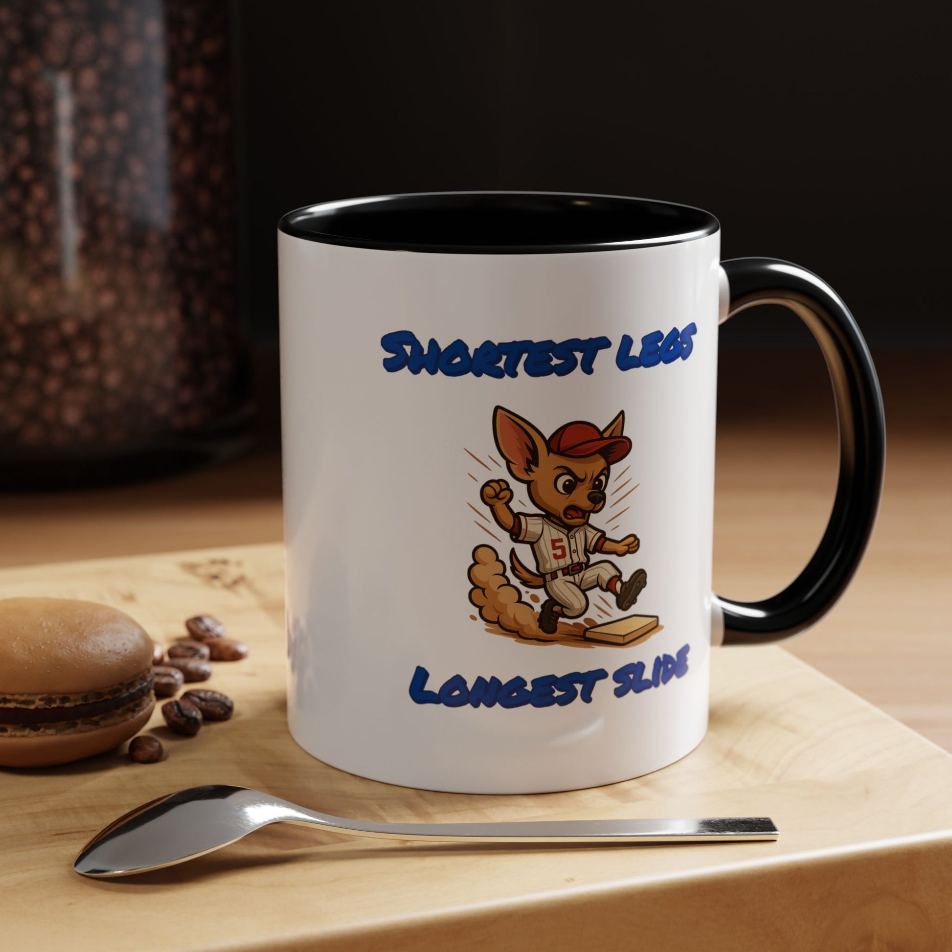 The image depicts a cartoon baseball-playing canine character sliding into a base with intense determination. Titled "Shortest Legs, Longest Slide", the graphic showcases a small dog wearing a white baseball uniform with the number 5 and a red cap. The character is mid-slide, kicking up a cloud of dust and displaying a fierce, focused expression. Stylized speed lines emphasize the dynamic motion of the slide, creating a sense of energy and movement. The illustration is set against a black background, making the blue title text and the yellow-orange dust cloud stand out vividly. The character's proportions are exaggerated for comedic effect, with particularly short legs contrasting with the dramatic sliding pose. The artwork has a playful, cartoon-like style that combines humor with athletic intensity. The blue text at the top and bottom of the image adds a punchy, graphic novel-esque quality to the design. This image appears to be a humorous take on baseball, highlighting the underdog spirit and determination of the small but mighty protagonist.