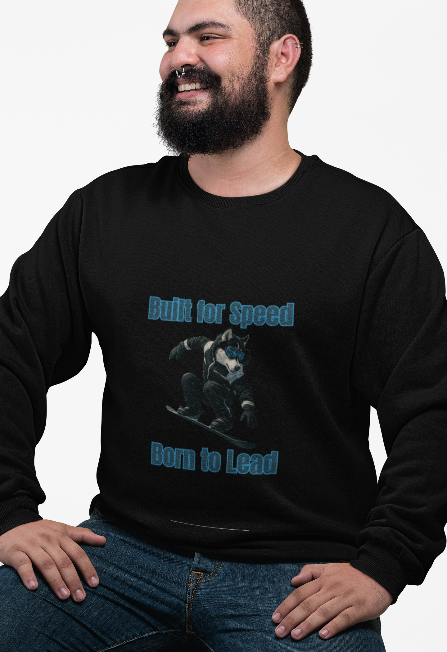 This graphic depicts a snowboarder mid-action, styled in a dynamic and energetic illustration. The image features text reading "Built for Speed" at the top and "Born to Lead" at the bottom, emphasizing a theme of athletic performance and leadership. The snowboarder is wearing ski goggles and appears to be in a crouched, forward-leaning position typical of high-speed snowboarding. The artwork has a stylized, graphic design feel with a slightly gritty, high-contrast aesthetic that gives the image a bold and powerful appearance. The snowboarder's pose suggests motion, skill, and a sense of adventure characteristic of extreme winter sports.Fantasy Dog Portraits