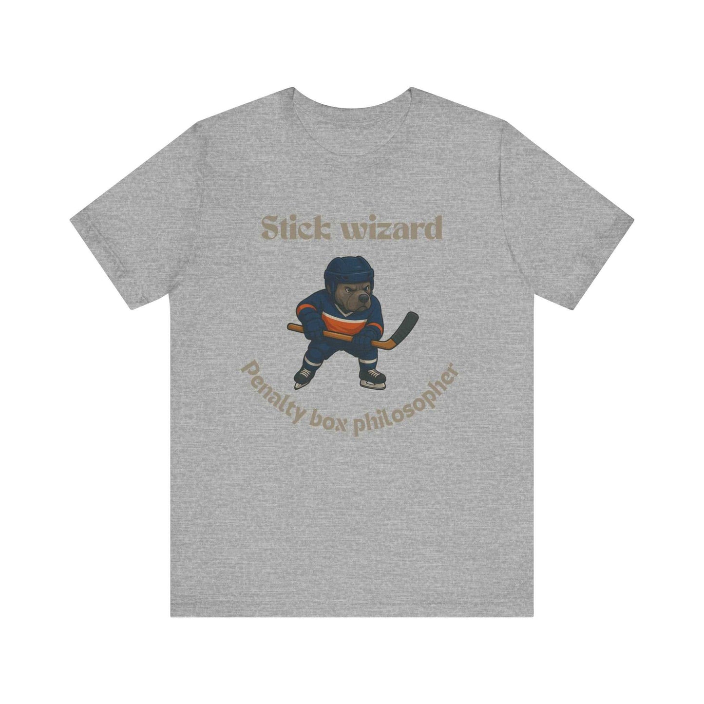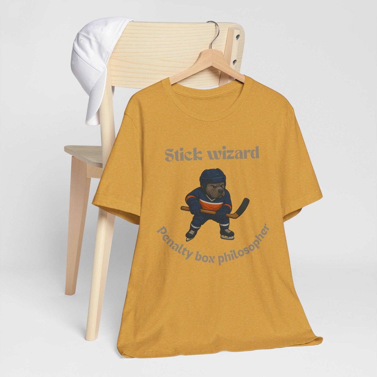 Introducing the "Stick Wizard: Penalty Box Philosopher" - a whimsical digital illustration that captures the essence of hockey culture with a playful twist. The image features an anthropomorphic dog dressed in a classic blue and orange hockey uniform, complete with a protective helmet and gloves, poised in a characteristic hockey stance. This charming graphic combines sporty athleticism with cartoon-like character design, creating a unique and memorable visual representation of hockey spirit. The dark background provides a stark contrast to the vibrant colors of the character, drawing the viewer's focus directly to the hockey-playing canine. The text "Stick wizard" and "Penalty box philosopher" add a humorous and philosophical dimension to the image, suggesting there's more to hockey than just the physical game. The detailed illustration showcases the character's determined expression and ready-to-play posture, embodying the passion and intensity of hockey players. This artwork would appeal to hockey fans, sports enthusiasts, and those who appreciate creative, character-driven design. The blend of humor, sports, and anthropomorphic art makes this image both entertaining and visually engaging. Whether used as merchandise, digital art, or promotional material, the "Stick Wizard" is sure to catch the eye and spark conversation. The image represents a clever and artistic take on the beloved sport of hockey, transforming a typical athlete into a charismatic, dog-like character.Fantasy Dog Portraits