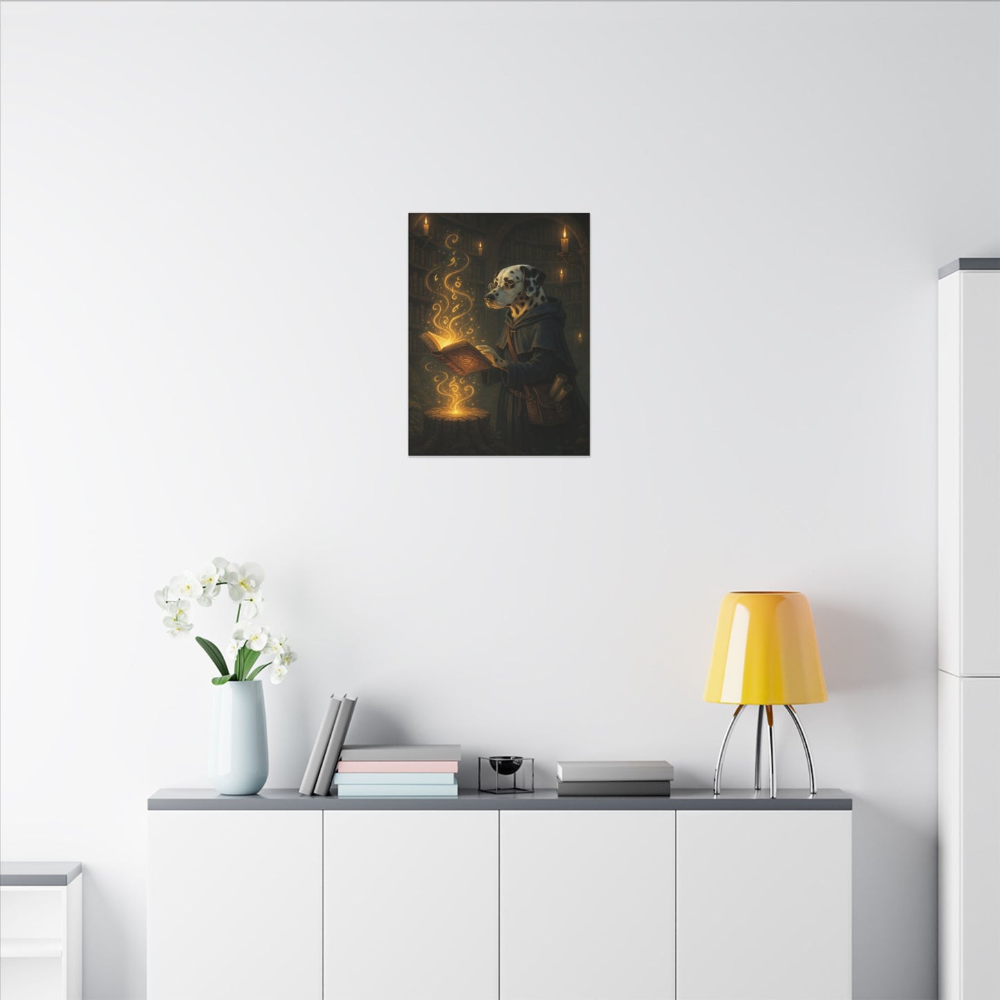 Immerse yourself in a captivating fantasy artwork featuring a Dalmatian wizard studying an ancient, magical tome in a dimly lit library. The mystical scene is illuminated by the warm glow of multiple candles, casting an enchanting light on the studious canine scholar. Dressed in a scholarly robe and wearing round spectacles, the dog intently reads from a golden-edged book, from which ethereal, glowing symbols and magical streams emerge. The intricate details of the scene showcase a rich, medieval-inspired environment with bookshelves lining the walls and a wooden pedestal bearing the magical essence rising from the open book. The golden, swirling magical energy creates an atmosphere of arcane knowledge and mystical discovery, suggesting the dog is deeply engaged in profound magical research. The artist's masterful use of light and shadow creates a sense of depth and mystery, drawing the viewer into this fantastical world of animal wizardry. Every element of the image, from the dog's focused expression to the intricate magical symbols, tells a story of wisdom, learning, and supernatural exploration. The warm color palette of golden browns, deep blues, and flickering candlelight evokes a sense of ancient knowledge and hidden secrets waiting to be uncovered. This remarkable illustration blends anthropomorphic fantasy with a rich, immersive magical aesthetic that captures the imagination. The artwork invites viewers to contemplate the magical potential of knowledge and the mysterious realms of arcane study.