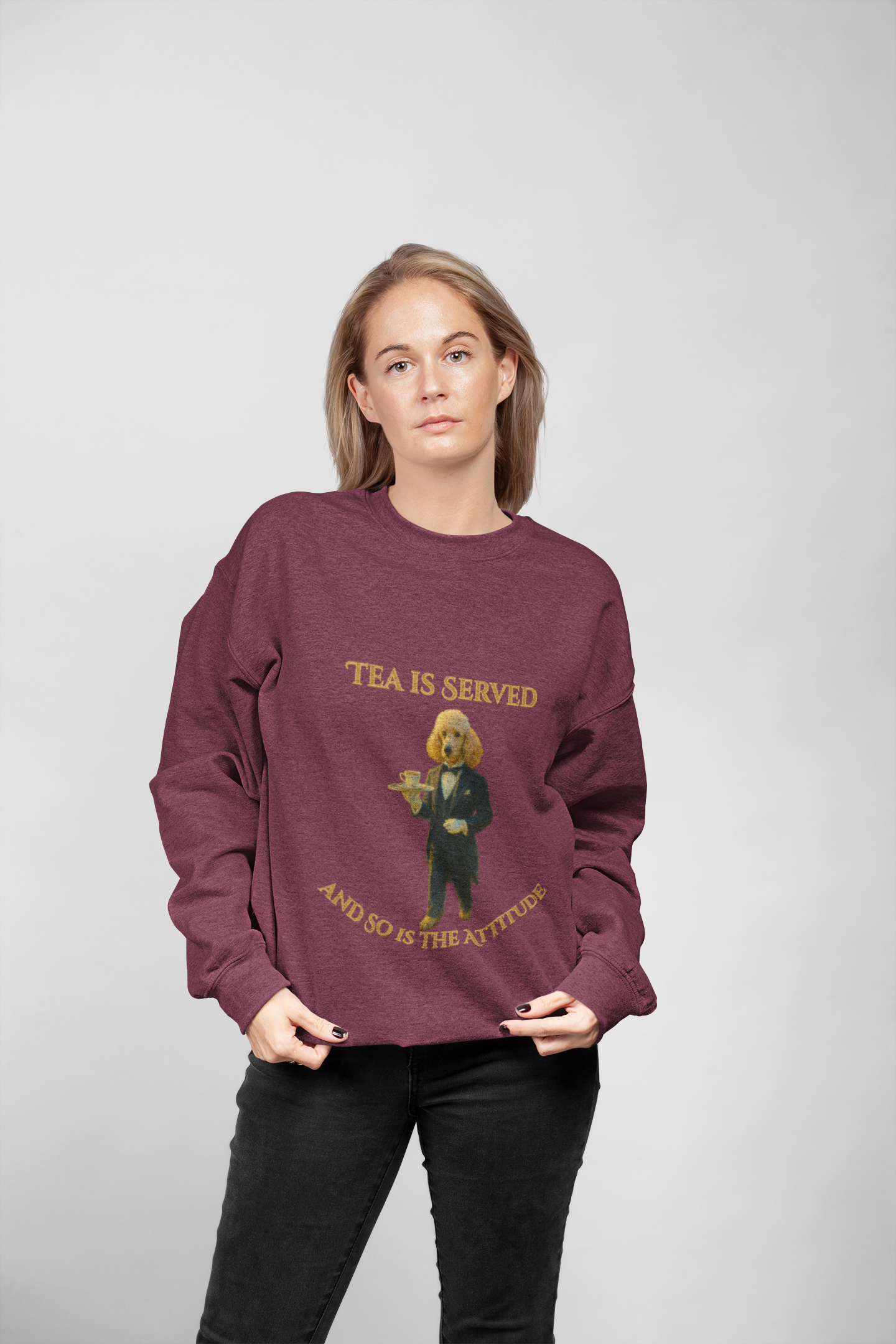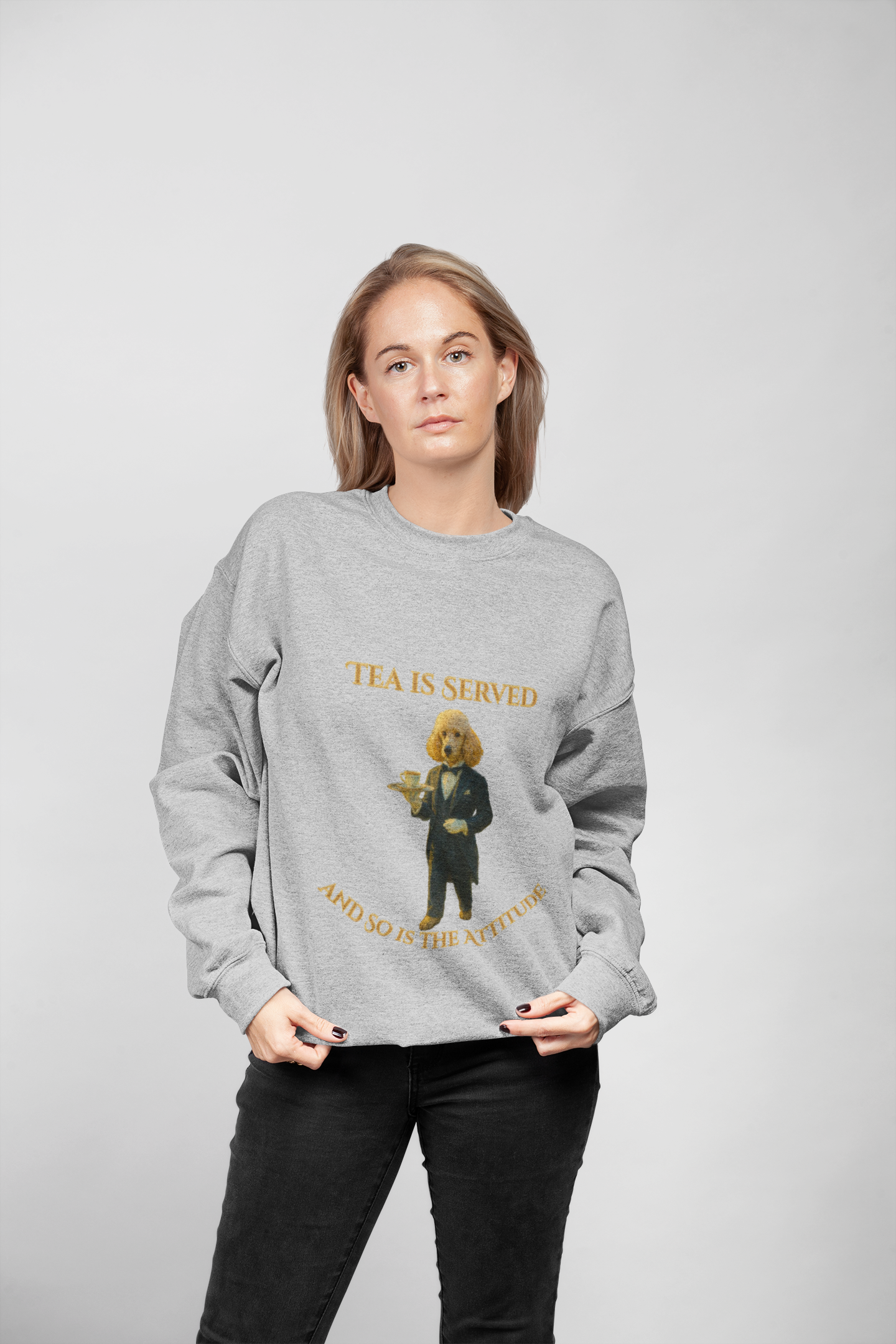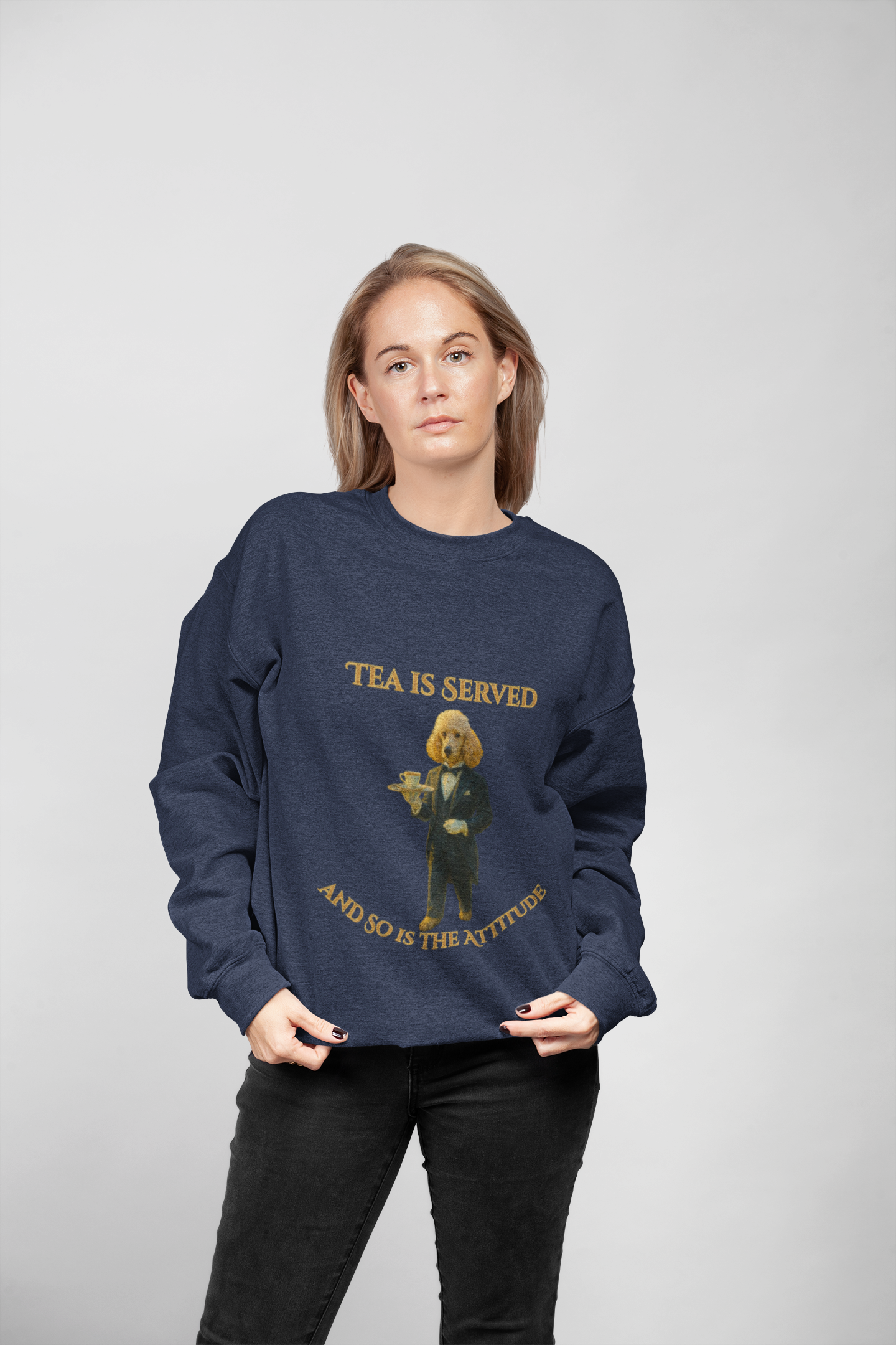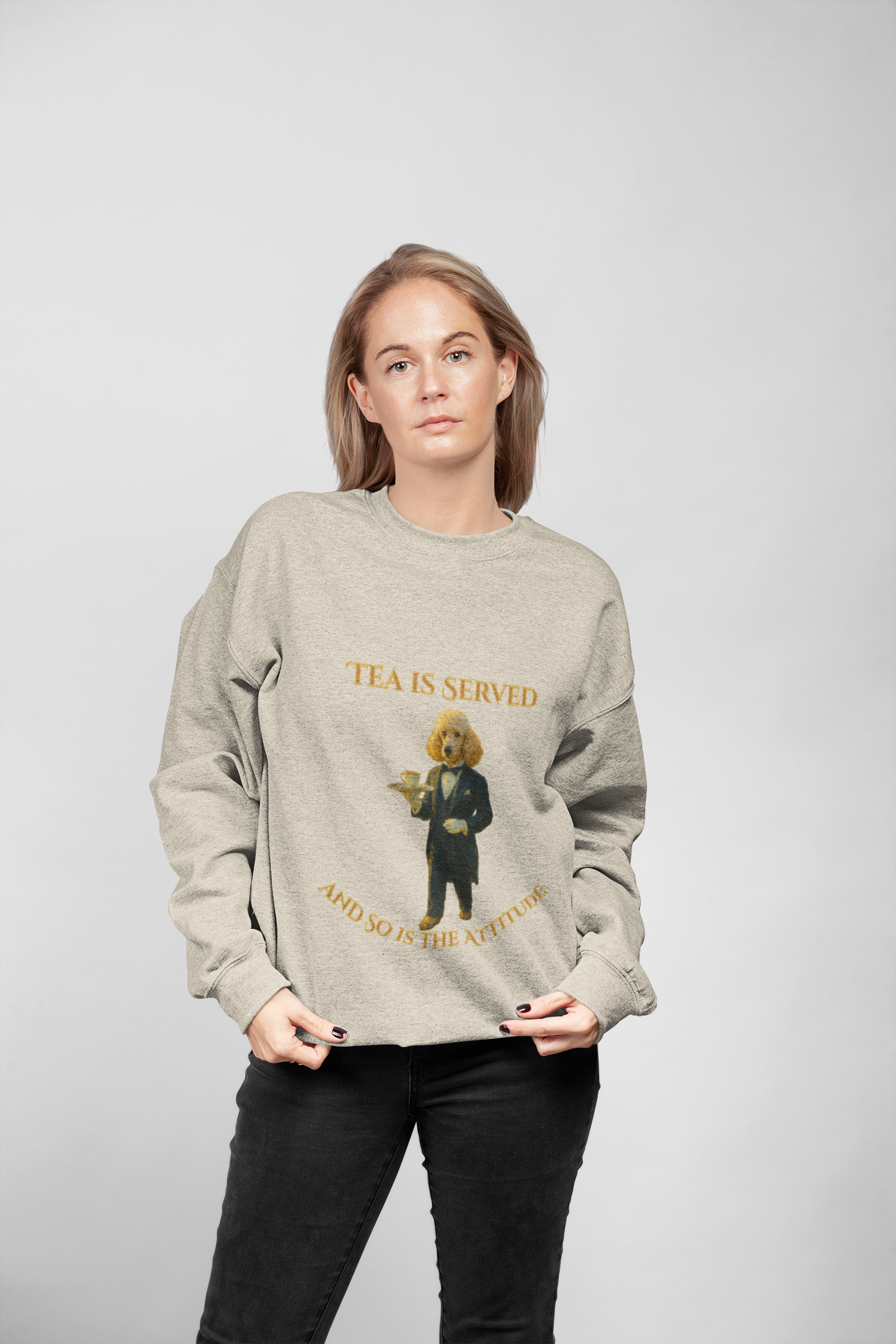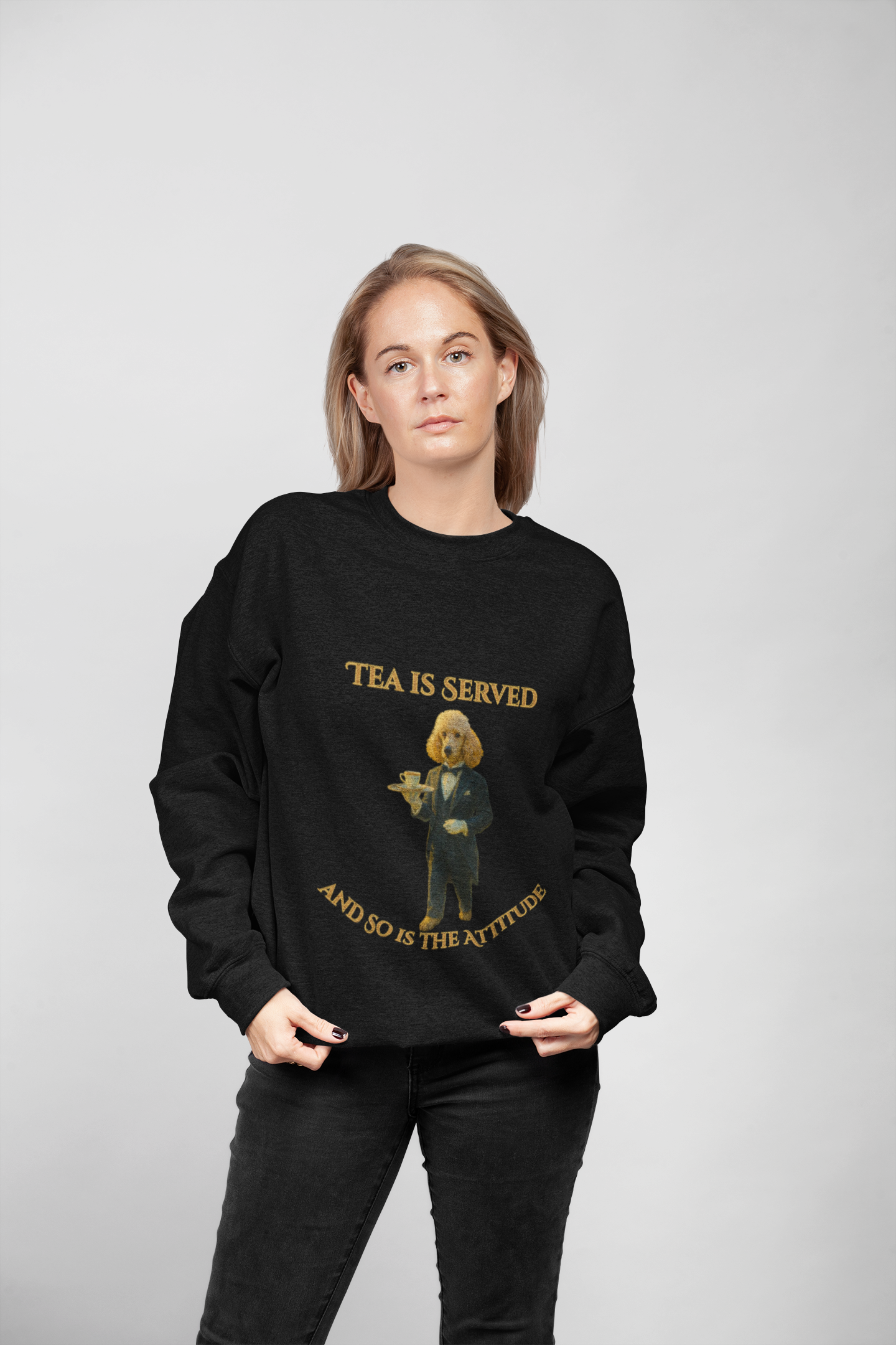 This whimsical digital artwork features a golden retriever or poodle dressed in an elegant black tailcoat and bow tie, posed as a sophisticated butler or server. The image is styled with a golden, decorative typography reading "TEA IS SERVED" at the top and "AND SO IS THE ATTITUDE" along the bottom curve. The dog is holding a tea tray with a delicate teacup, standing upright in a humanoid pose that exudes refinement and humor. The artwork appears to be a digital illustration or photomanipulation with a vintage, slightly painterly aesthetic. The color palette is dominated by warm golden tones and deep black, creating a sense of classic elegance with a playful twist.Fantasy Dog Portraits