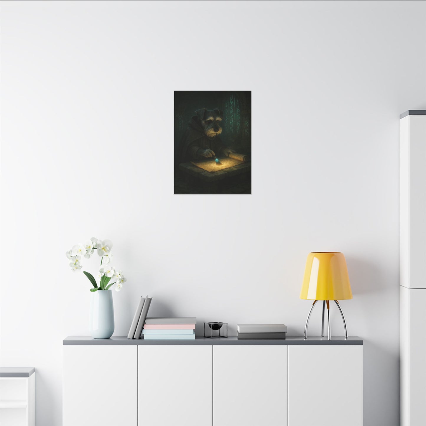 In this enchanting fantasy artwork, a scholarly Schnauzer dog is depicted as a mystical scribe, hunched over an ancient manuscript in a dimly lit, atmospheric setting. The canine scholar wears a dark, hooded robe, carefully illuminating a yellowed scroll with a glowing blue brush. Intricate, ethereal runes and symbols line the background, suggesting a world of magical knowledge and arcane wisdom. The dog's expressive face, with its characteristic beard and intent gaze, conveys a sense of deep concentration and intellectual purpose. The scene is bathed in a moody, emerald-green light that creates a sense of mystery and otherworldly intrigue. The detailed rendering of the dog's fur, the delicate brush, and the aged scroll showcase the artist's exceptional skill in creating a rich, imaginative narrative. This image blends anthropomorphic characterization with a medieval scholarly aesthetic, transforming an ordinary dog into a keeper of secrets and ancient lore. The composition draws the viewer into a world where animals possess human-like intelligence and mystical capabilities. The soft, focused lighting emphasizes the importance of the moment, suggesting that the Schnauzer is engaged in a task of great significance. The artwork invites viewers to imagine the hidden stories and magical knowledge contained within the scroll.