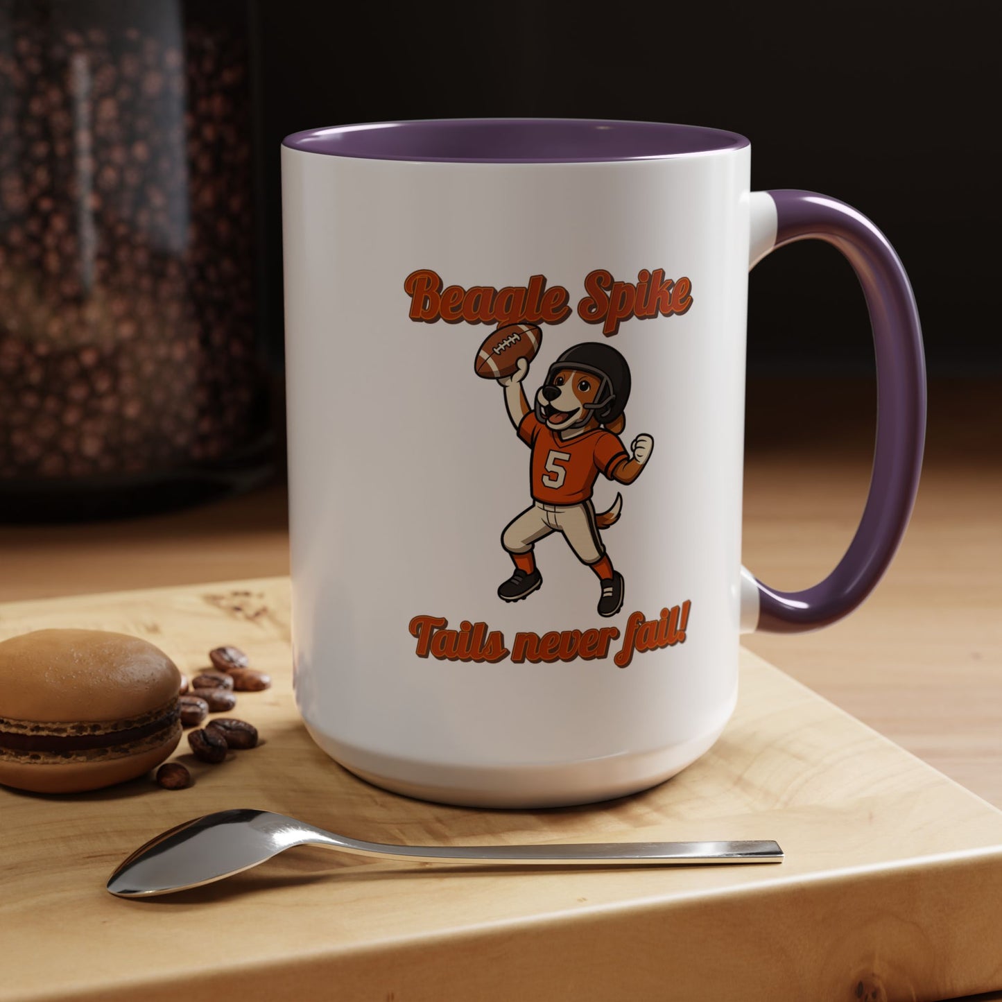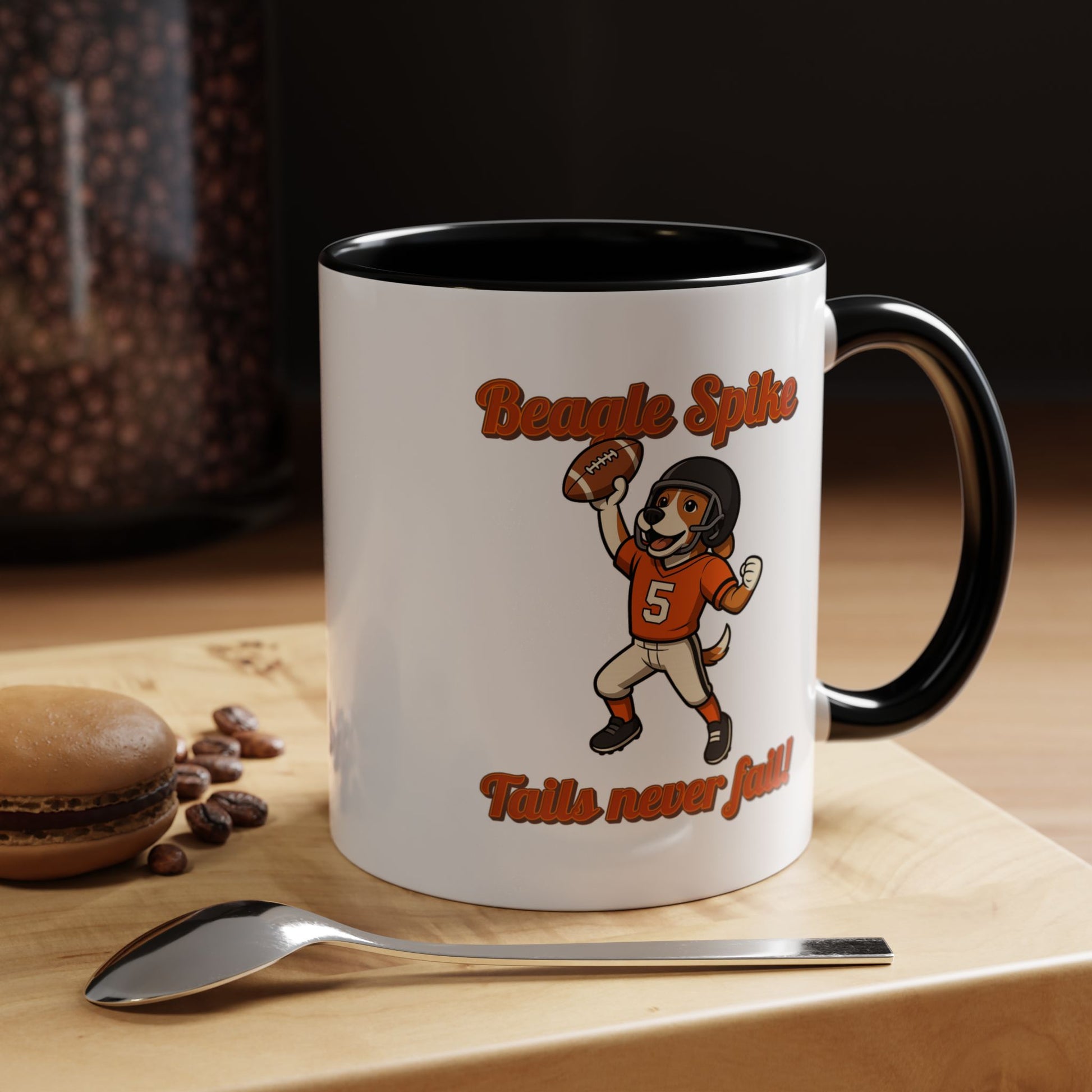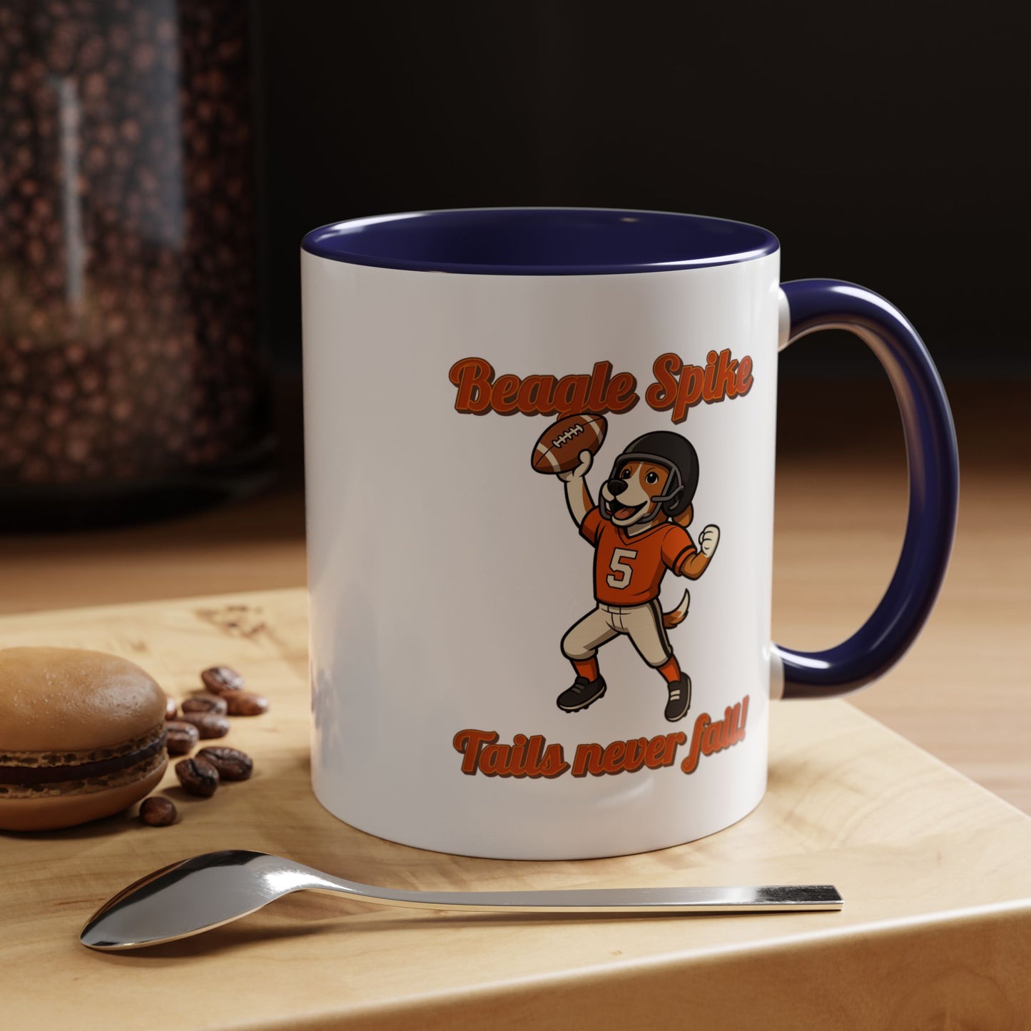 Introducing "Beagle Spike", a vibrant and playful cartoon illustration that captures the spirit of American football through the lens of a spirited beagle athlete. The image features an adorable beagle wearing a black helmet and an orange jersey with the number 5, striking a dynamic pose with a football held high in celebration. The dog's enthusiastic expression and raised paw convey a sense of triumph and excitement, embodying the "Tails never fail!" motto that appears at the bottom of the graphic. Rendered in a colorful, cartoon style, the illustration uses a palette of orange, white, and black to create a bold and eye-catching design. The beagle is depicted in mid-action, with one leg raised and a look of pure joy, perfectly capturing the energy and passion of sports. The typography is equally engaging, with the "Beagle Spike" text arching over the character in a stylized, three-dimensional orange font that adds depth and visual interest. The character's uniform and equipment are meticulously detailed, from the textured football to the sports jersey and cleats, giving the illustration a professional and polished look. This charming image is not just a cute depiction of a dog, but a clever play on words that combines the football term "spike" with the breed name, creating a memorable and entertaining visual pun. The "Tails never fail!" tagline at the bottom reinforces the message of perseverance, determination, and sporting spirit. Overall, this illustration is a delightful and creative representation of athletic enthusiasm, sure to bring a smile to sports fans and dog lovers alike.