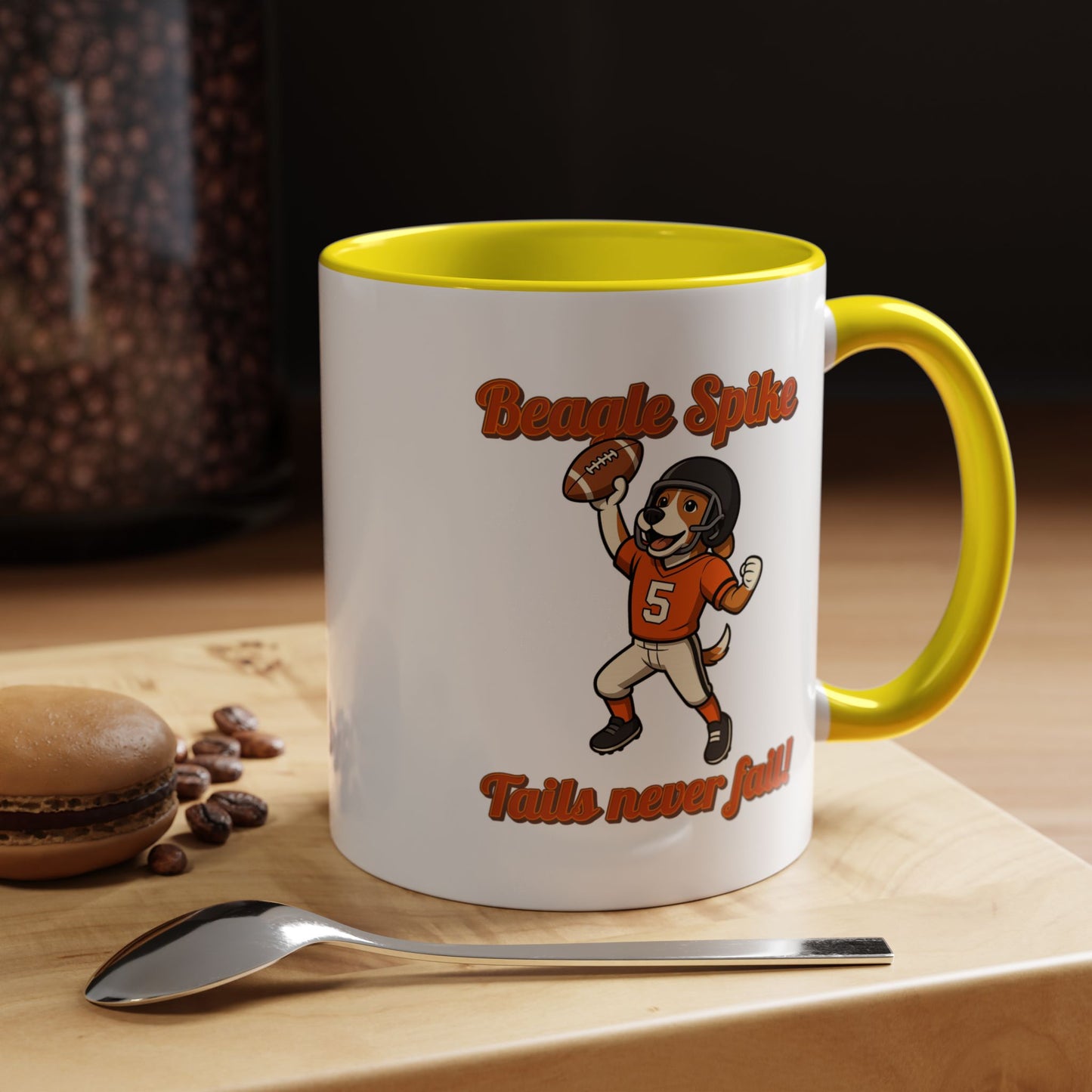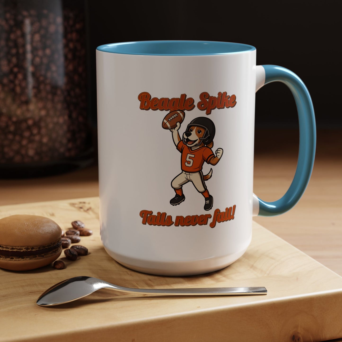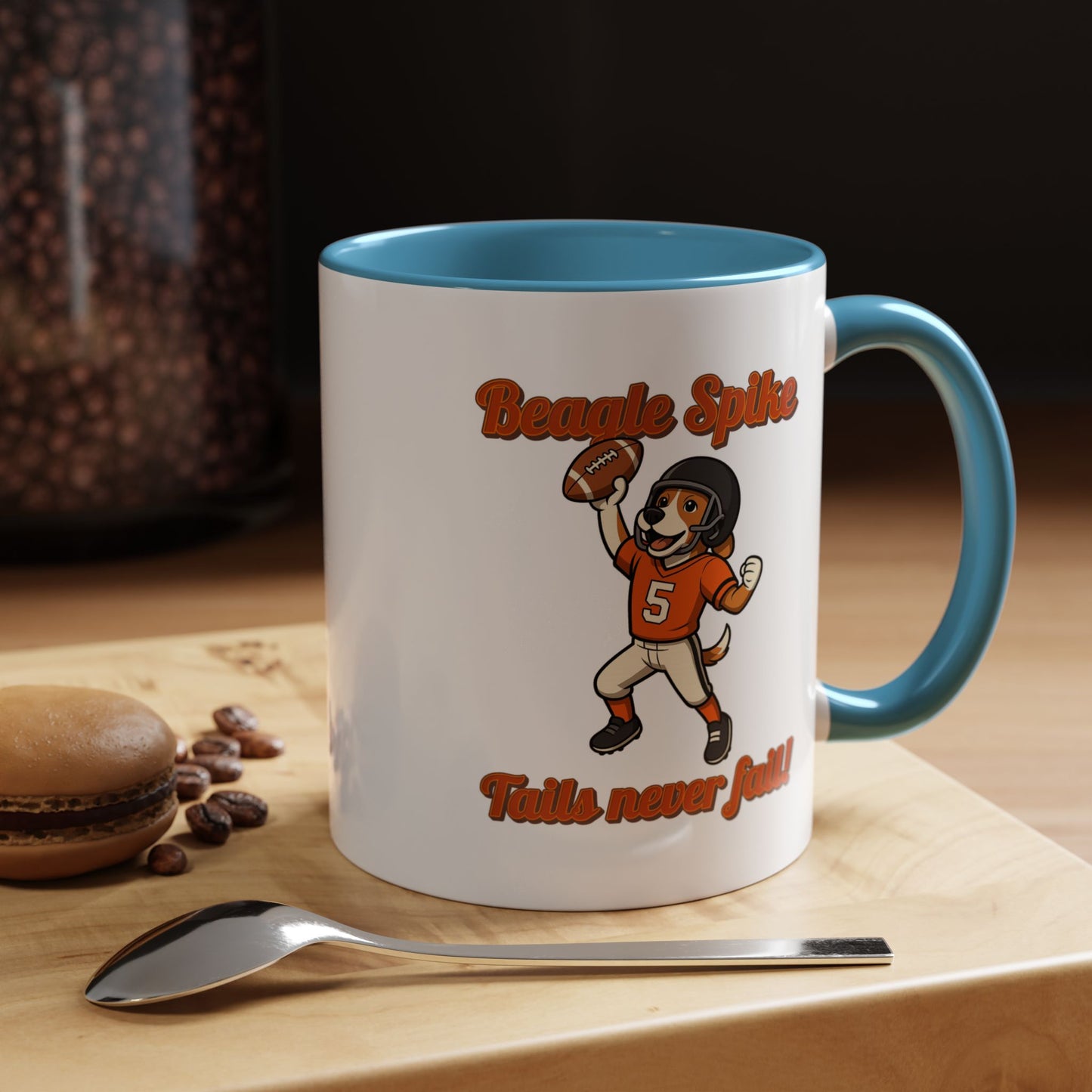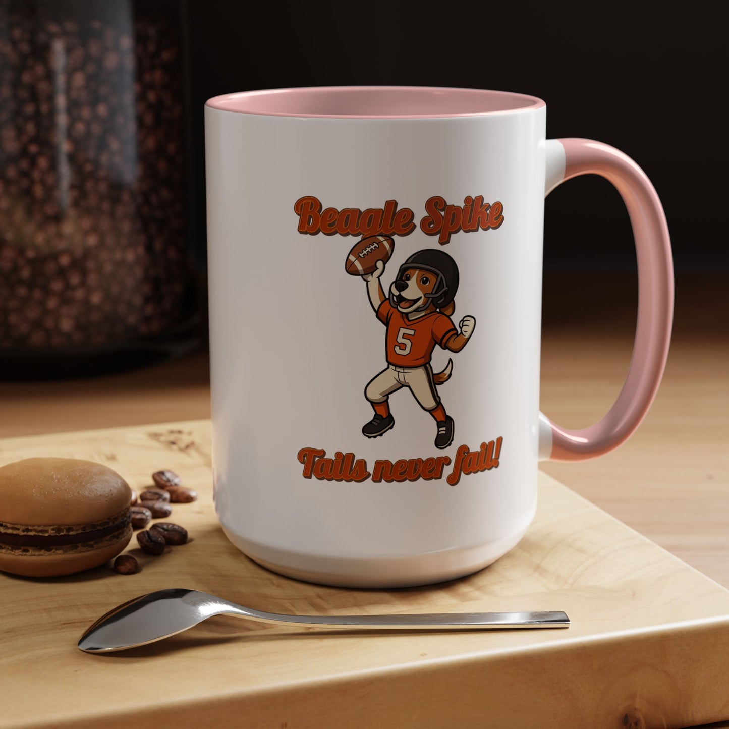 Introducing "Beagle Spike", a vibrant and playful cartoon illustration that captures the spirit of American football through the lens of a spirited beagle athlete. The image features an adorable beagle wearing a black helmet and an orange jersey with the number 5, striking a dynamic pose with a football held high in celebration. The dog's enthusiastic expression and raised paw convey a sense of triumph and excitement, embodying the "Tails never fail!" motto that appears at the bottom of the graphic. Rendered in a colorful, cartoon style, the illustration uses a palette of orange, white, and black to create a bold and eye-catching design. The beagle is depicted in mid-action, with one leg raised and a look of pure joy, perfectly capturing the energy and passion of sports. The typography is equally engaging, with the "Beagle Spike" text arching over the character in a stylized, three-dimensional orange font that adds depth and visual interest. The character's uniform and equipment are meticulously detailed, from the textured football to the sports jersey and cleats, giving the illustration a professional and polished look. This charming image is not just a cute depiction of a dog, but a clever play on words that combines the football term "spike" with the breed name, creating a memorable and entertaining visual pun. The "Tails never fail!" tagline at the bottom reinforces the message of perseverance, determination, and sporting spirit. Overall, this illustration is a delightful and creative representation of athletic enthusiasm, sure to bring a smile to sports fans and dog lovers alike.