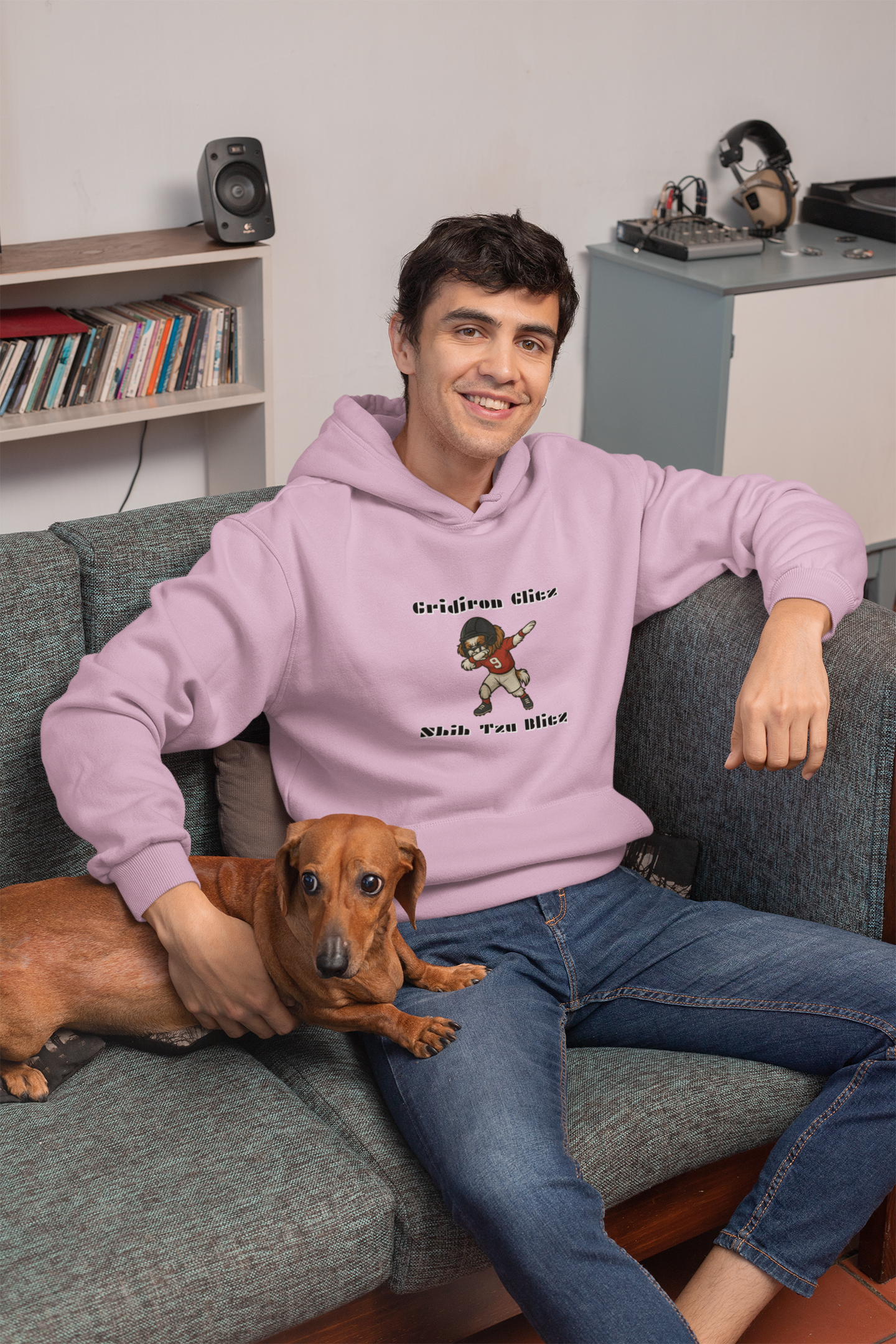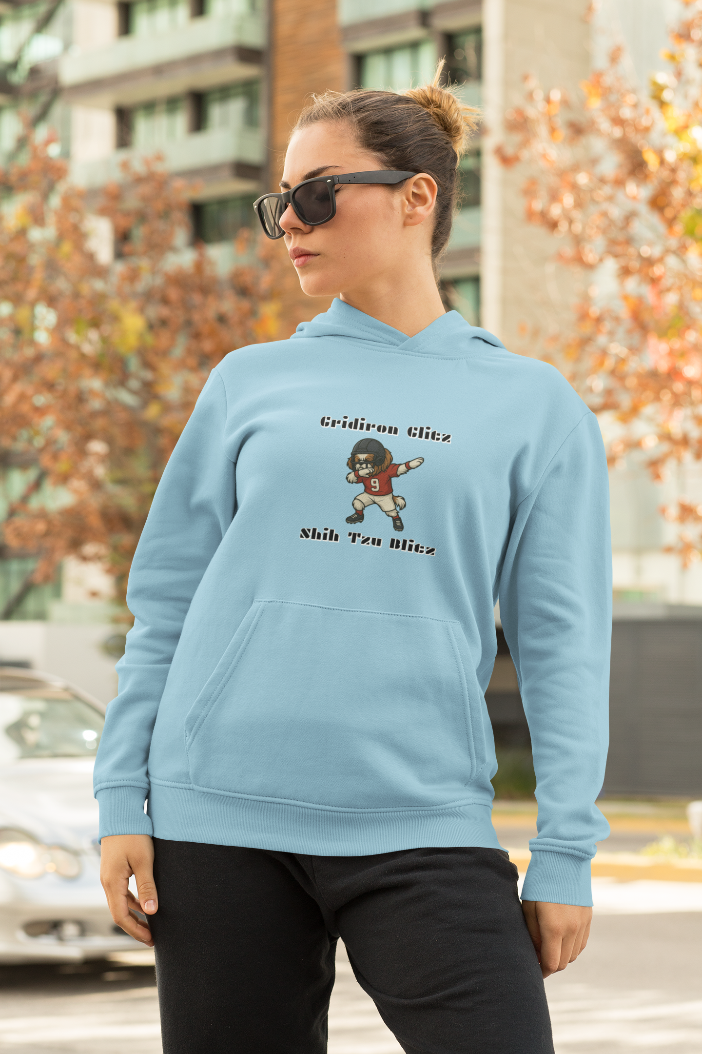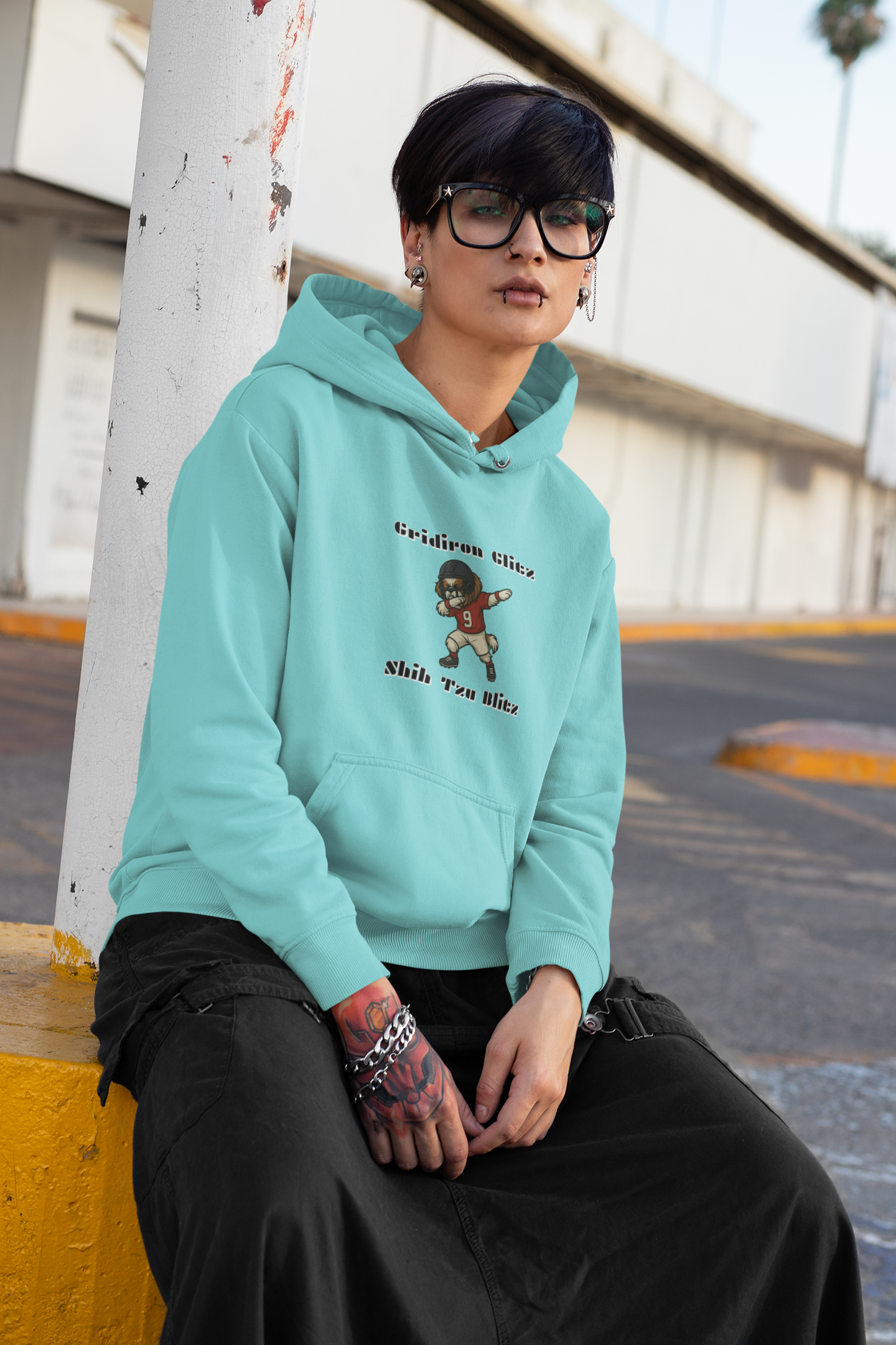 Dive into the world of "Gridiron Glitz" with this eye-catching graphic featuring a spirited cartoon mascot that embodies the essence of football swagger. The illustration showcases a fierce, anthropomorphic character wearing a red jersey with the number 9, complete with a protective helmet and a bold, confident stance. Set against a sleek black background, the design captures the raw energy and attitude of the sport, with the character seeming to dab or strike a dynamic pose. The stylized typography "Gridiron Glitz" and "Shib Tzn Blitz" adds a playful, edgy element to the artwork, suggesting a fusion of sports culture and internet meme humor. The mascot appears to be a stylized representation of a Shih Tzu breed, cleverly transformed into a football player with an attitude. The graphic uses a vibrant color palette of red, white, and black, creating a striking visual impact that draws the viewer's attention. Every detail, from the character's muscular pose to the carefully designed uniform, speaks to the spirit of competition and fun. The image seems to be a humorous take on sports mascots, blending cute animal characteristics with the tough-guy persona of football players. It's a perfect representation of the intersection between pop culture, sports, and internet humor. The design would likely appeal to sports fans, dog lovers, and those who appreciate quirky, creative illustrations.Fantasy Dog Portraits