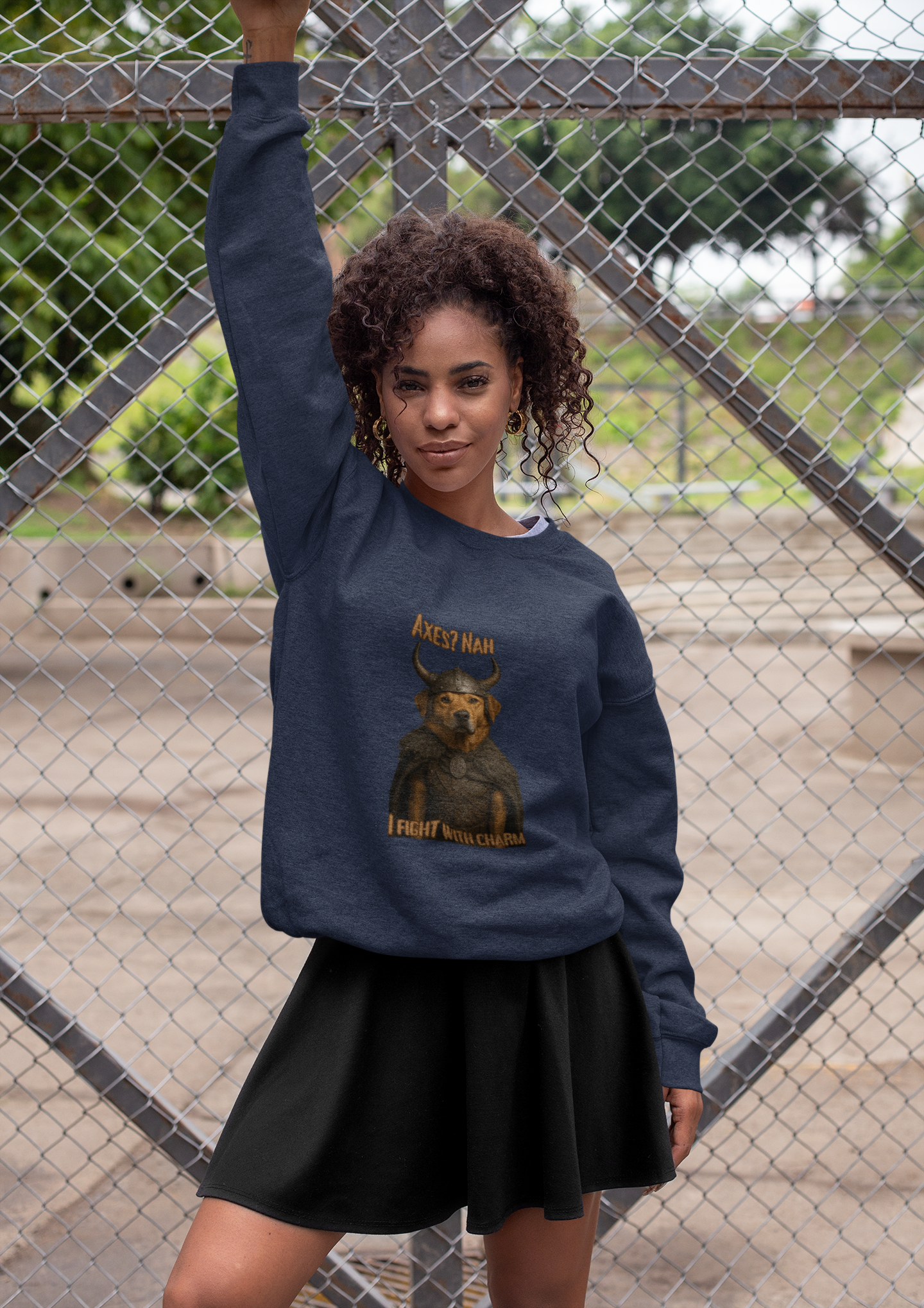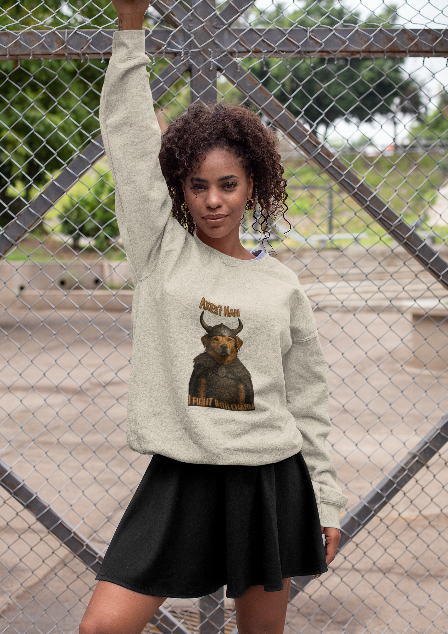 This humorous digital artwork depicts a dog wearing a Viking-style horned helmet, styled as a medieval warrior with a fur-trimmed cape and a decorative brooch. The text "Axes? Nah" and "Fight with Charm" add a playful twist to the warrior theme, suggesting the dog prefers diplomacy over aggression. The image is a creative photomanipulation that transforms the canine into a charming, anthropomorphic Viking character. The graphic has a stylized, meme-like quality with bold typography and a whimsical concept. The dog's expression and costume create a comedic contrast between fierce Viking imagery and the animal's inherent adorable nature.Fantasy Dog Portraits