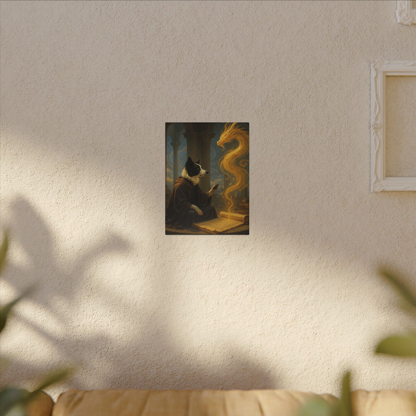 In this mesmerizing fantasy artwork, a Border Collie-like creature sits robed in a monastic setting, surrounded by ancient columns and stacks of books, engaged in a mystical encounter with a luminous golden dragon spirit. The dragon emerges ethereally from an open scroll, its form crafted entirely of swirling, flame-like energy that seems alive with magical potential. Soft blue and golden tones create a dreamlike atmosphere, suggesting a realm between reality and imagination. The robed canine figure appears contemplative and focused, raising one paw towards the magnificent golden apparition with an air of reverence and understanding. Intricate architectural details in the background hint at a sacred, scholarly environment, with ornate columns framing the scene and lending a sense of timeless wisdom. The golden dragon's form is sinuous and elegant, its body composed of undulating flames that twist and curl with an almost sentient grace. Stacks of ancient texts surrounding the figure imply deep mystical knowledge and arcane learning. The lighting in the scene is dramatic, with the golden energy of the dragon casting a warm, illuminating glow against the cooler background tones. Every element of the composition suggests a profound moment of magical communication or spiritual revelation. The artwork masterfully blends elements of fantasy, mysticism, and anthropomorphic storytelling into a single, captivating image.